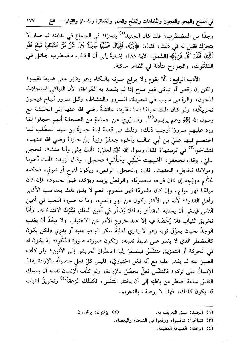 الأدب الرابع : ألا يقوم ولا يرفع صوته بالبكاء وهو يقدر على ضبط نفسه ، ولكن إن رقص أو تباكى فهو مباح إذا لم يقصد به المراءاة ، لأن التباكي استجلاب للحزن ، والرقص سبب في تحريك السرور والنشاط ، وكل سرور مباح فيجوز تحريكه ، ولو كان ذلك حراماً لما نظرت عائشة رضي الله عنها إلى الحبشة مع رسول الله ( صلى الله عليه وسلم ) وهم يزفنون . وقد روي عن جماعة من الصحابة أنهم حجلوا لما ورد عليهم سرور أوجب ذلك وذلك في قصة ابنة حمزة بن عبد المطلب لما اختصم فيا علي بن أبي طالب وأخوه جعفر وزيد بن حارثة رضي الله عنهم ، فتشاحوا في تربيتها ، فقال رسول الله ( صلى الله عليه وسلم ) لعلي : " أنت مني وأنا منك " فحجل علي . وقال لجعفر : " أشبهت خلقي وخلقي " فحجل . وقال لزيد : " أنت أخونا ومولانا " فحجل . الحديث . قال : والحجل : الرقص ، ويكون لفرح أو شوق ، فحكمه حكم مهيجه إن كان فرحه محموداً ، والرقص يزيده ويؤكده فهو محمود ، فإن كان مباحاً فهو مباح ، وإن كان مذموماً فهو مذموم . نعم لا يليق ذلك بمناصب الأكابر وأهل القدوة لأنه في الأكثر يكون عن لهو ولعب ، وما له صورة اللعب في أعين الناس فينبغي أن يجتنبه المقتدي به لئلا يصغر في أعين الخلق فيترك الاقتداء به . وأما تخريق الثياب فلا رخصة فيه إلا عند خروج الأمر عن الاختيار . ولا يبعد أن يغلب الوجد بحيث يمزق ثوبه وهو لا يدري لغلبة سكر الوجد عليه أو يدري ولكن يكون كالمضطر الذي لا يقدر على ضبط نفسه ، وتكون صورته صورة المكره ، إذ يكون له في الحركة أو التمزيق متنفس فيضطر إليه اضطرار المريض إلى الأنين ، ولو كلف الصبر عنه لم يقدر عليه مع أنه فعل اختياري ، فليس كل فعل حصوله بالإرادة يقدر الإنسان على تركه ، فالتنفس فعل يحصل بالإرادة ، ولو كلف الإنسان نفسه أن يمسك التنفس ساعة اضطر من باطنه إلى أن يختار التنفس ، فكذلك الزعقة وتخريق الثياب قد يكون كذلك فهذا لا يوصف بالتحريم .