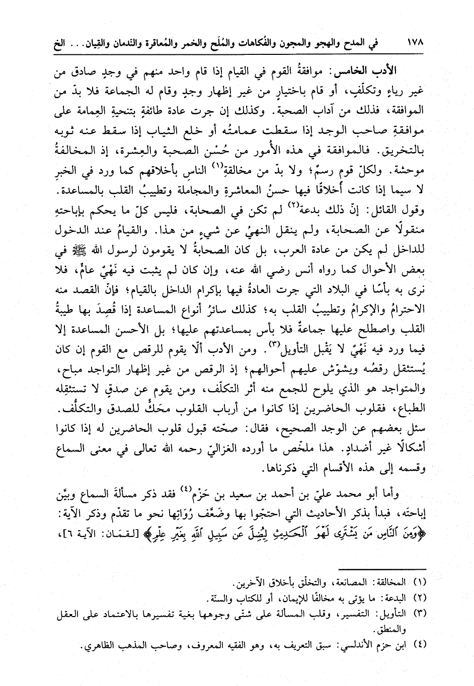 الأدب الخامس : موافقة القوم في القيام إذا قام واحد منهم في وجد صادق من غير رياء وتكلف ، أو قام باختيار من غير إظهار وجد وقام له الجماعة فلا بد من الموافقة ، فذلك من آداب الصحبة . وكذلك إن جرت عادة طائفة بتنحية العمامة على موافقة صاحب الوجد إذا سقطت عمامته أو خلع الثياب إذا سقط عنه ثوبه بالتخريق . فالموافقة في هذه الأمور من حسن الصحبة والعشرة ، غذ المخالفة موحشة . ولكل قوم رسم ، ولا بد من مخالفة الناس بأخلاقهم كما ورد في الخبر لا سيما إذا كانت أخلاقاً فيها حسن المعاشرة والمجاملة وتطييب القلب بالمساعدة . وقول القائل : إن ذلك بدعة لم تكن في الصحابة ، فليس كل ما يحكم بإباحته منقولاً عن الصحابة ولم ينقل النهي عن شيء من هذا . والقيام عند الدخول للداخل لم تكن من عادة العرب ، بل كان الصحابة لا يقومون لرسول الله ( صلى الله عليه وسلم ) في بعض الأحوال كما رواه أنس رضي الله عنه ، وإن كان لم يثبت فيه نهي عام ، فلا نرى به بأساً في البلاد التي جرت العادة فيها بإكرام الداخل بالقيام ، فإن القصد منه الاحترام والإكرام وتطييب القلب به ، كذلك سائر أنواع المساعدة إذا قصد بها طيبة القلب واصطلح عليها جماعة فلا بأس بمساعدتهم عليها ، بل الأحسن المساعدة إلا فيما ورد فيه نهي لا يقبل التأويل . ومن الأدب ألا يقوم للرقص مع القوم إن كان يستثقل رقصه ويشوش عليهم أحوالهم ، إذ الرقص من غير إظهار التواجد مباح ، والمتواجد هو الذي يلوح للجميع منه أثر التكلف ، ومن يقوم عن صدق لا تستثقله الطباع ، فقلوب الحاضرين إذا كانوا من أرباب القلوب محك للصدق والتكلف . سئل بعضهم عن الوجد الصحيح فقال : صحته قبول قلوب الحاضرين له إذا كانوا أشكالاً غير أضداد . هذا ملخص ما أورده الغزالي رحمه الله تعالى في معنى السماع وقسمه إلى هذه الأقسام التي ذكرناها .