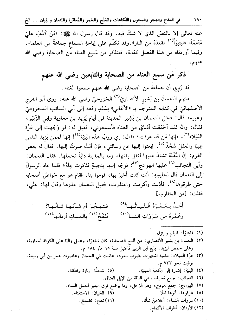 عنه تعالى إلا بالنص الذي لا شك فيه . وقد قال رسول الله ( صلى الله عليه وسلم ) : " من كذب علي متعمداً فليتبوأ مقعده من النار " . وقد تكلم على إباحة السماع جماعة من العلماء . وفيما أوردناه من هذا الفصل كفاية . فلنذكر من سمع الغناء من الصحابة رضي الله عنهم .