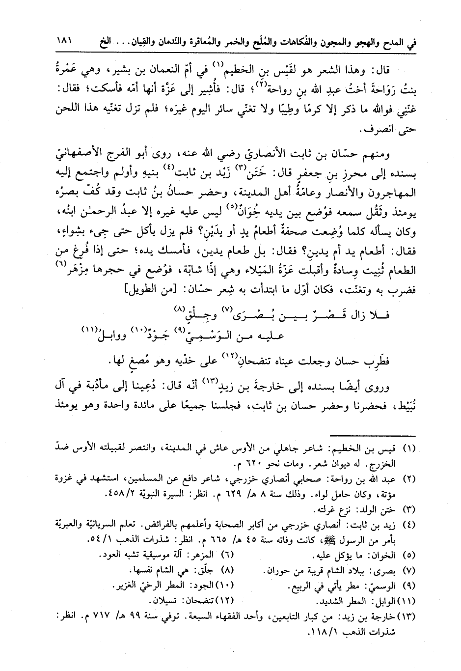 ومنهم حسان بن ثابت الأنصاري رضي الله عنه ، روى أبو الفرج الأصفهاني بسنده إلى محرز بن جعفر قال : ختن زيد بن ثابت بنيه وأولم واجتمع إليه المهاجرون والأنصار وعامة أهل المدينة ، وحضر حسان بن ثابت وقد كف بصره يومئذ وثقل سمعه فوضع بين يديه خوان ليس عليه غيره إلا عبد الرحمن ابنه ، وكان يسأله كلما وضعت صحفة أطعام يد أم يدين ؟ فلم يزل يأكل حتى جيء بالشواء ، فقل : أطعام يد أم يدين ؟ فقال : بل طعام يدين ، فأمسك يده ، حتى إذا فرغ من الطعام ثنيت وسادة وأقبلت عزة الميلاء وهي إذاً شابة ، فوضع في حجرها مزهر فضربت به وتغنت ، فكان أول ما ابتدأت به شعر حسان :