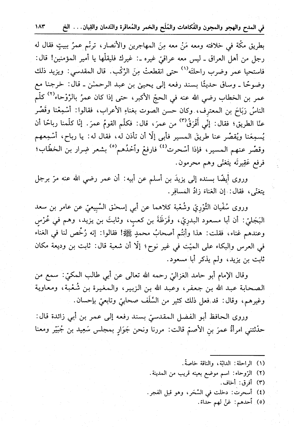بطريق مكة في خلافته ومعه من معه من المهاجرين والأنصار ، ترنم عمر ببيت فقال له رجل من أهل العراق - ليس معه عراقي غيره - : غيرك فليقلها يا أمير المؤمنين قال : فاستحيا عمر وضرب راحلته حتى انقطعت من الركب . قال المقدسي : ويزد ذلك وضوحاً - وساق حديثاً بسند رفعه إلى يحيى بن عبد الرحمن - قال : خرجنا مع عمر بن الخطاب رضي الله عنه في الحج الأكبر ، حتى إذا كان عمر بالروحاء كلم الناس رباح بن المعترف ، وكان حسن الصوت بغناء الأعراب ، فقالوا : أسمعنا وقصر عنا الطريق ، فقال : إني أفرق من عمر . قال : فكلم القوم عمر . إنا كلمنا رباحاً أن يسمعنا ويقصر لنا طريق المسير فأبى إلا أن تأذن له . فقال له : يا رباح ، أسمعهم وقصر عنهم المسير ، فإذا أسحرت فارفع واحدهم بشعر ضرار بن الخطاب ، فرفع عقيرته يتغنى وهم محرمون .