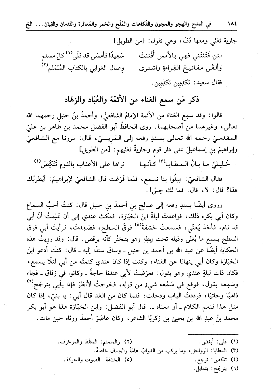 فقال الشافعي : ميلوا بنا نسمع . فلما فرغت قال الشافعي لإبراهيم : أيطربك هذا ؟ قال لا . قال : فما لك حس وروى أيضاً بسند رفعه إلى صالح بن أحمد بن حنبل قال : كنت أحب السماع وكان أبي يكره ذلك ، فواعدت ليلة ابن الخبازة ، فمكث عندي إلى أن علمت أن أبي قد نام ، فأخذ يغني ، فسمعت خشفة فوق السطح ، فصعدت ، فرأيت أبي فوق السطح يسمع ما يغني وذيله تحت إبطه وهو يتبختر كأنه يرقص . قال : وقد رويت هذه الحكاية أيضاً عن عبد الله بن أحمد بن حنبل - وساق سنداً إليه - قال : كنت أدعو ابن الخبازة وكان أبي ينهانا عن الغناء ، وكنت إذا كان عندي كتمته من أبي لئلا يسمع . فكان ذات ليلة عندي وهو يقول ، فعرضت لأبي عندنا حاجة - وكانوا في زقاق - فجاء وسمعه يقول ، فوقع في سمعه شيء من قوله ، فخرجت لأنظر فإذا بأبي يترجح ذاهبا ًوجائياً ، فرددت الباب ودخلت . فلما كان من الغد قال أبي : يا بني ، إذا كان مثل هذا فنعم الكلام ، أو معناه . قال أبو الفضل : وابن الخبازة هذا هو أبو بكر محمد بن عبد الله بن يحيى بن زكريا الشاعر ، وكان عاصر أحمد ورثاه حين مات .