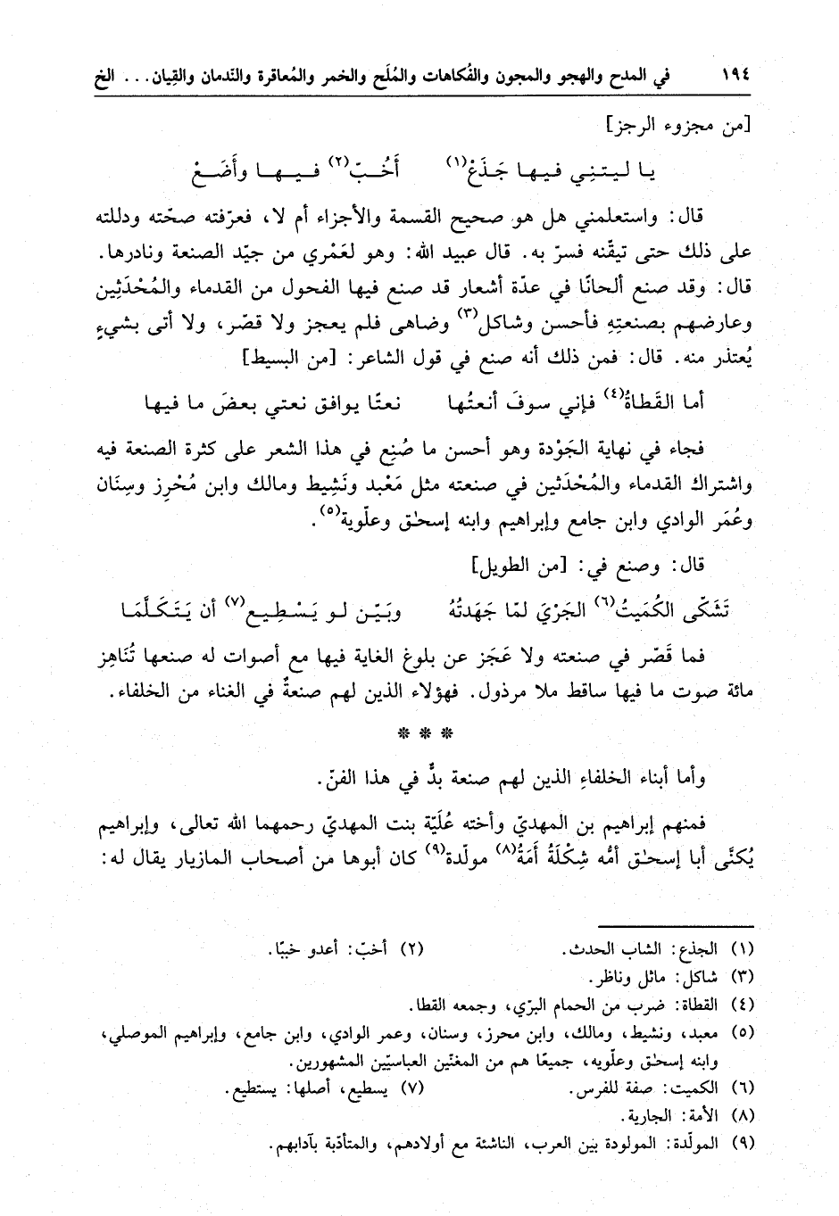 فما قصر في صنعته ولا عجز عن بلوغ الغاية فيها مع اصوات له صنعها تناهز مائة صوت ما فيها ساقط ولا مرذول . فهؤلاء الذين لهم صنعة في الغناء من الخلفاء .