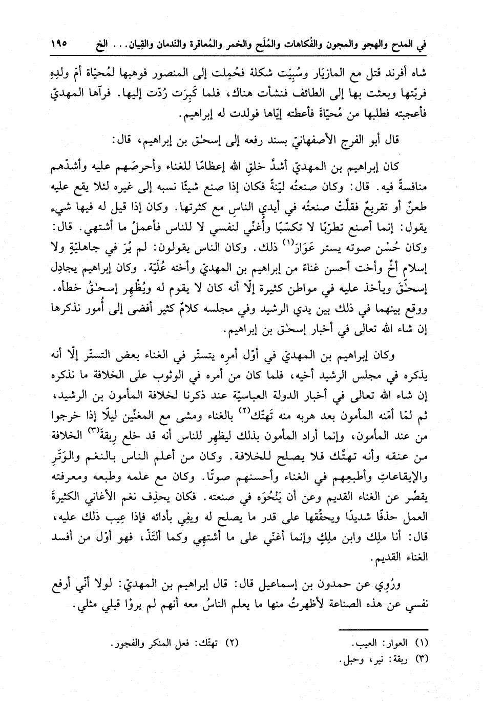 وكان إبراهيم بن المهدي في أول أمره يتستر في الغناء بعض التستر إلا أنه يذكره في مجلس الرشيد أخيه . فلما كان من أمره في الوثوب على الخلافة ما نذكره إن شاء الله تعالى في أخبار الدولة العباسية عند ذكرنا لخلافة المأمون بن الرشيد ، ثم لما أمنه المأمون بعد هربه منه تهتك بالغناء ومشى مع المغنين ليلا إذا خرجوا من عند المأمون ، وإنما أراد المأمون بذلك ليظهر للناس أنه قد خلع ربقة الخلافة من عنقه وأنه تهنك فلا يصلح للخلافة . وكان من أعلم الناس بالنغم والوتر والإيقاعات وأطبعهم في الغناء وأحسنهم صوتا . وكان مع علمه وطبعه ومعرفته يقصر عن الغناء القديم وعن أن ينحوه في صنعته . فكان يحذف نغم الأغاني الكثيرة العمل حذفا شديدا ويحققها على قدر ما يصلح له ويفي بأدائه فإذا عيب ذلك عليه قال : أنا ملك وأبن ملكٍ وإنما أغني على ما أشتهي وكما ألتذ . فهو أول من أفسد الغناء القديم .