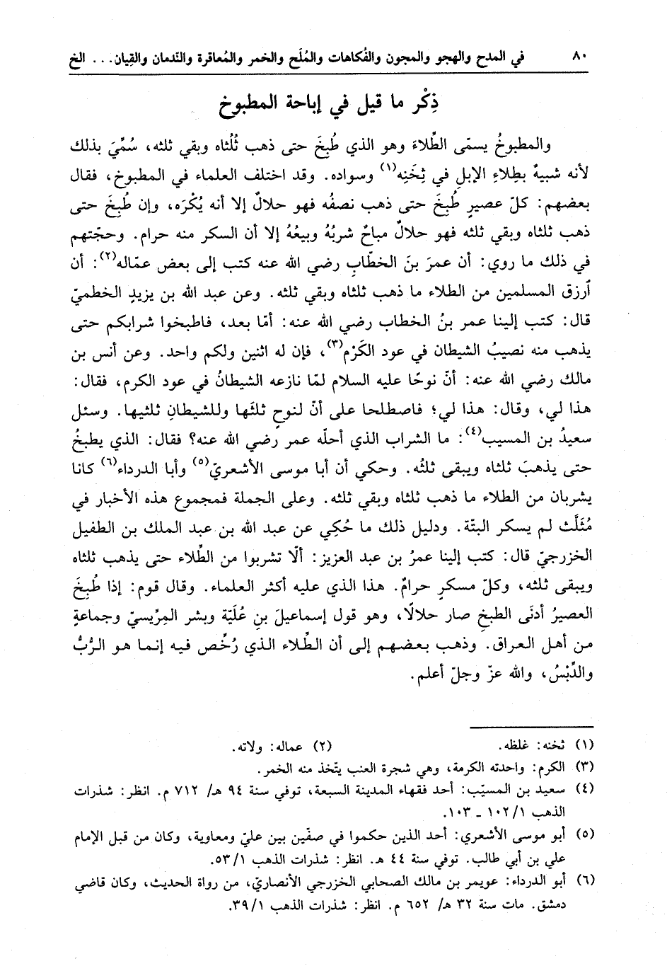 والمطبوخ يسمى الطلاء وهو الذي طبخ حتى ذهب ثلثاه وبقي ثلثه . سمي بذلك لأنه شبيه بطلاء الإبل في ثخنه وسواده . وقد اختلف العلماء في المطبوخ ، فقال بعضهم : كل عصير طبخ حتى ذهب نصفه فهو حلال إلا أنه يكره ، وإن طبخ حتى ذهب ثلثاه وبقي ثلثه فهو حلال مباح شربه وبيعه إلا أن السكر منه حرام . وحجتهم في ذلك ما روي : أن عمر بن الخطاب رضي الله عنه كتب إلى بعض عماله : أن ارزق المسلمين من الطلاء ما ذهب ثلثاه وبقي ثلثه . وعن عبد الله بن يزيد الخطمي قال : كتب إلينا عمر بن الخطاب رضي الله عنه : أما بعد ، فاطبخوا شرابكم حتى يذهب منه نصيب الشيطان في عود الكرم ، فإن له اثنين ولكم واحد . وعن أنس بن مالك رضي الله عنه : أن نوحاً عليه السلام لما نازعه الشيطان في عود الكرم فقال : هذا لي ، وقال : هذا لي ، فاصطلحا على أن لنوح ثلثها وللشيطان ثلثيها . وسئل سعيد بن المسيب : ما الشراب الذي أحله عمر رضي الله عنه ؟ فقال : الذي يطبخ حتى يذهب ثلثاه ويبقى ثلثه . وحكي أن أبا موسى الأشعري وأبا الدرداء كانا يشربان من الطلاء ما ذهب ثلثاه وبقي ثلثه . وعلى الجملة فمجموع هذه الأخبار في مثلث لم يسكر البتة . ودليل ذلك ما حكي عن عبد الله بن عبد الملك ابن الطفيل الخزرجي قال : كتب إلينا عمر بن عبد العزيز : ألا تشربوا من الطلاء حتى يذهب ثلثاه ويبقى ثلثه ، وكل مسكر حرام . هذا الذي عليه أكثر العلماء . وقال قوم : إذا طبخ العصير أدنى الطبخ صار حلالاً ، وهو قول إسماعيل بن علية وبشر المريسي وجماعة من أهل العراق . وذهب بعضهم إلى أن الطلاء الذي رخص فيه إنما هو الرب والدبس . والله عز وجل أعلم .