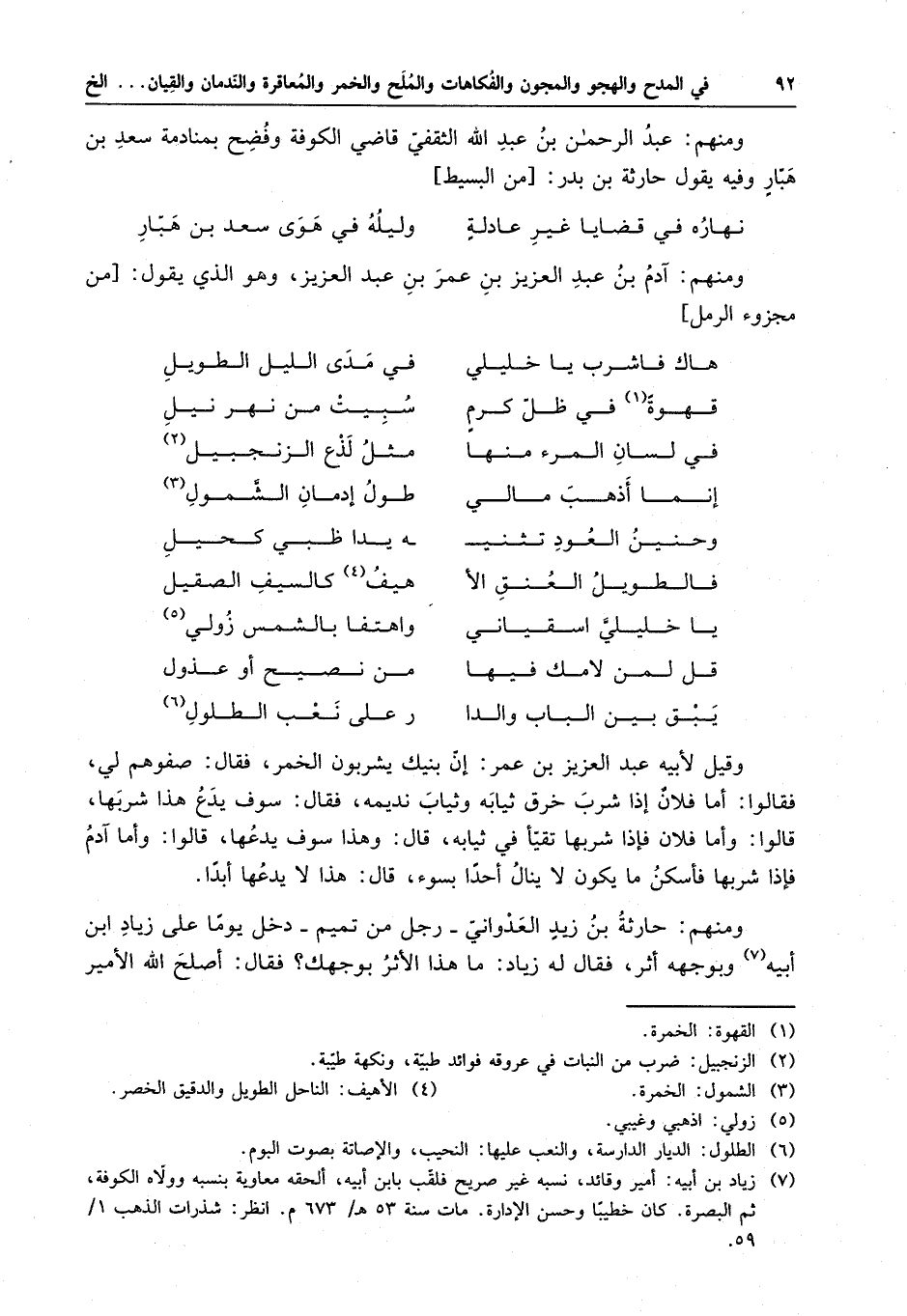 ومنهم : عبد الرحمن بن عبد الله الثقفي قاضي الكوفة وفضح بمنادمة سعد بن هبار وفيه يقول حارثة بن بدر :