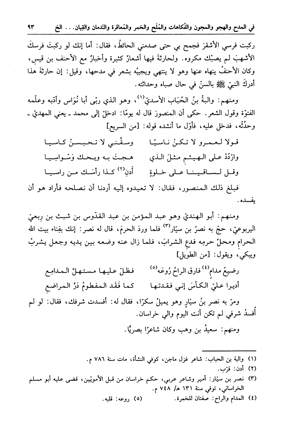 ومنهم : أبو الهندي وهو عبد المؤمن بن عبد القدوس بن شبث بن ربعي اليربوعي ، حج به نصر بن سيار فلما ورد الحرم قال له نصر : إنك بفناء بيت الله الحرام ومحل حرمه فدع الشراب ، فلما زال عنه وضعه بين يديه وجعل يشرب ويبكي ويقول : رضيع مدام فارق الراح روعه . . . فظل عليها مستهل المدامع