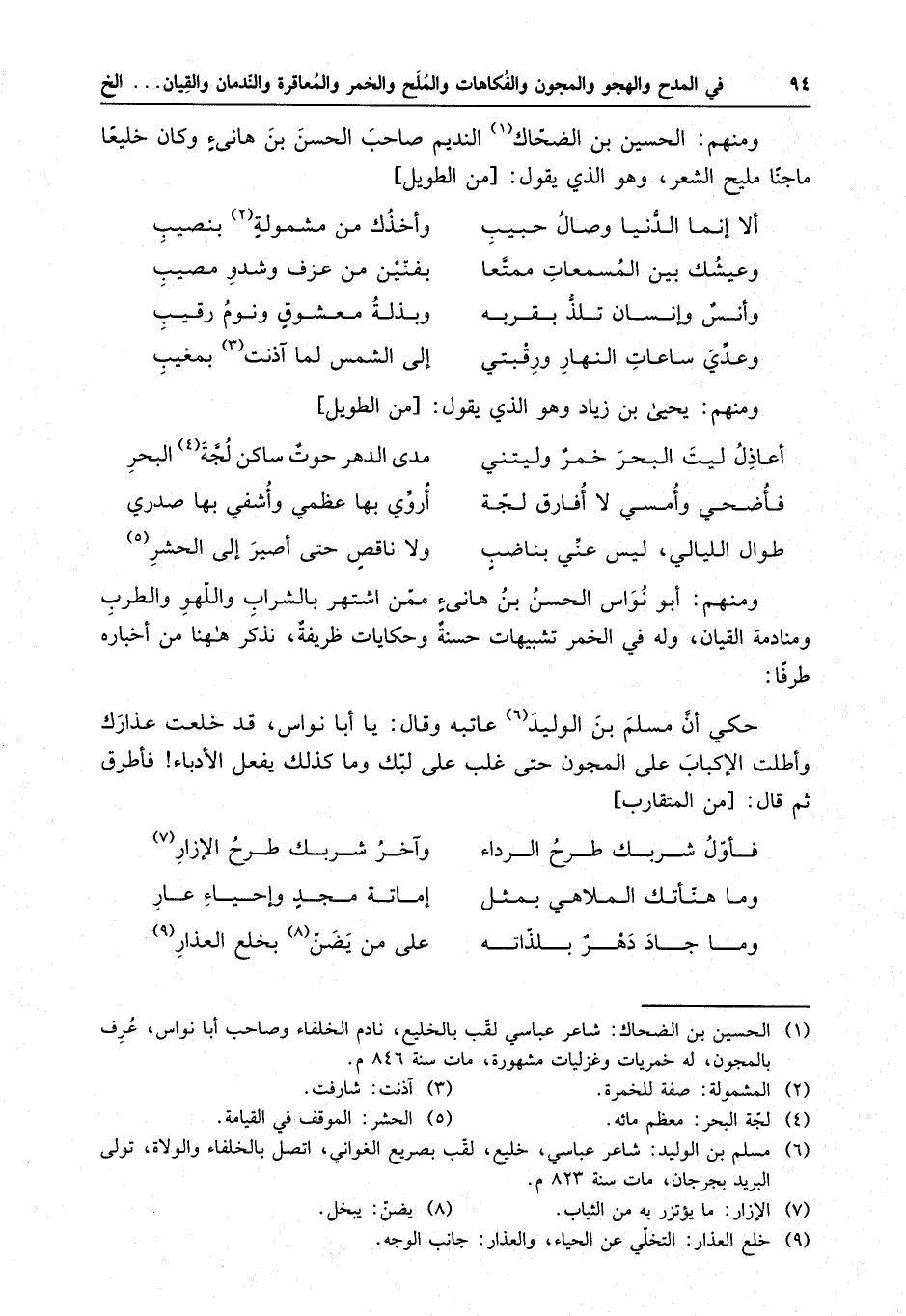 ومنهم : الحسين بن الضحاك النديم صاحب الحسن بن هانئ وكان خليعاً ماجناً مليح الشعر وهو الذي يقول :