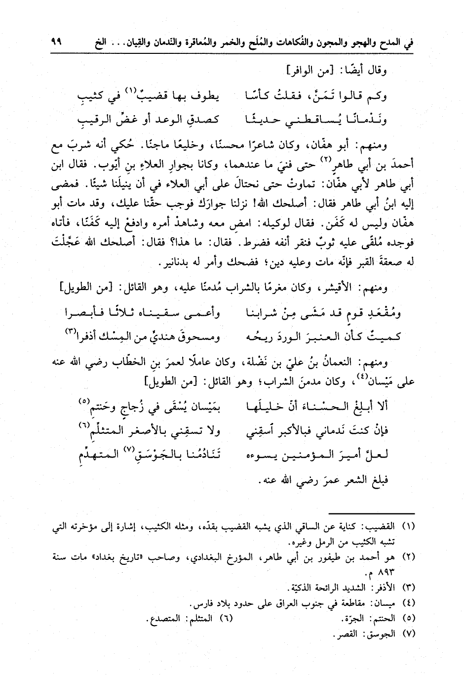 ومنهم : أبو هفان . وكان شاعراً محسناً ، وخليعاً ماجناً . حكى أنه شرب مع أحمد بن أبي طاهر حتى فنى ما عندهما ، وكانا بجوار العلاء بن أيوب . فقال ابن أبي طاهر لأبي هفان : تماوت حتى نحتال على أبي العلاء في أن ينيلنا شيئاً . فمضى إليه ابن أبي طاهر فقال : أصلحك الله نزلنا جوارك فوجب حقنا عليك ، وقد مات أبو هفان وليس له كفن . فقال لوكيله : امض معه وشاهد أمره وادفع إليه كفناً . فأتاه فوجده ملقى عليه ثوب فنقر أنفه فضرط . فقال : ما هذا ؟ فقال : أصلحك الله عجلت له صعقة القبر فإنه مات وعليه دين ، فضحك وأمر له بدنانير .