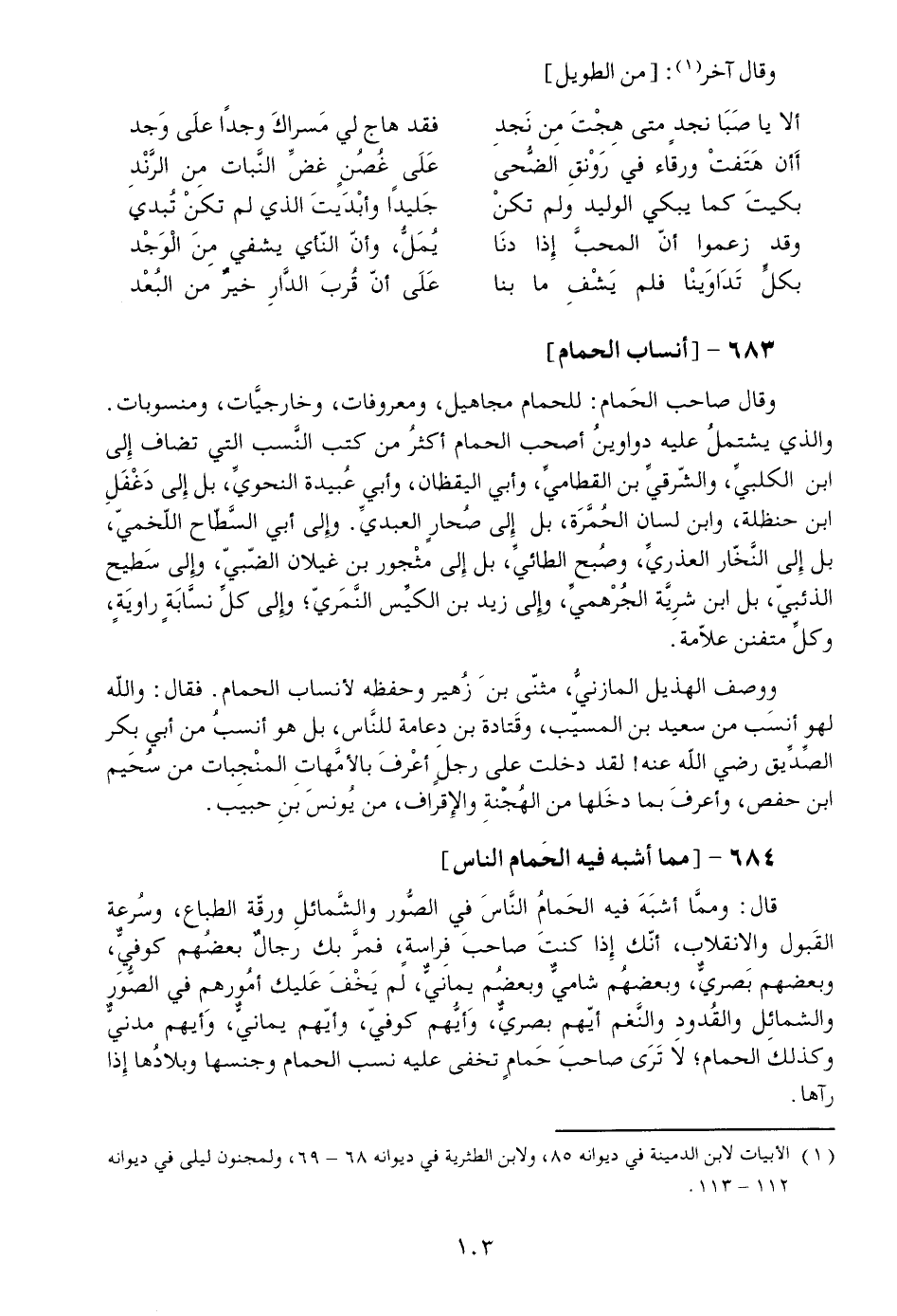 والذي يشتمل عليه دواوين أصحب الحمام أكثر من كتب النّسب التي تضاف إلى ابن الكلبيّ، والشّرقيّ بن القطاميّ، وأبي اليقظان، وأبي عبيدة النحويّ، بل إلى دغفل ابن حنظلة، وابن لسان الحمّرة، بل إلى صحار العبديّ. وإلى أبي السّطّاح اللّخميّ، بل إلى النّخّار العذريّ، وصبح الطائيّ، بل إلى مثجور بن غيلان الضّبيّ، وإلى سطيح الذئبيّ، بل ابن شريّة الجرهميّ، وإلى زيد بن الكيّس النّمريّ؛ وإلى كلّ نسّابة راوية، وكلّ متفنن علّامة.
