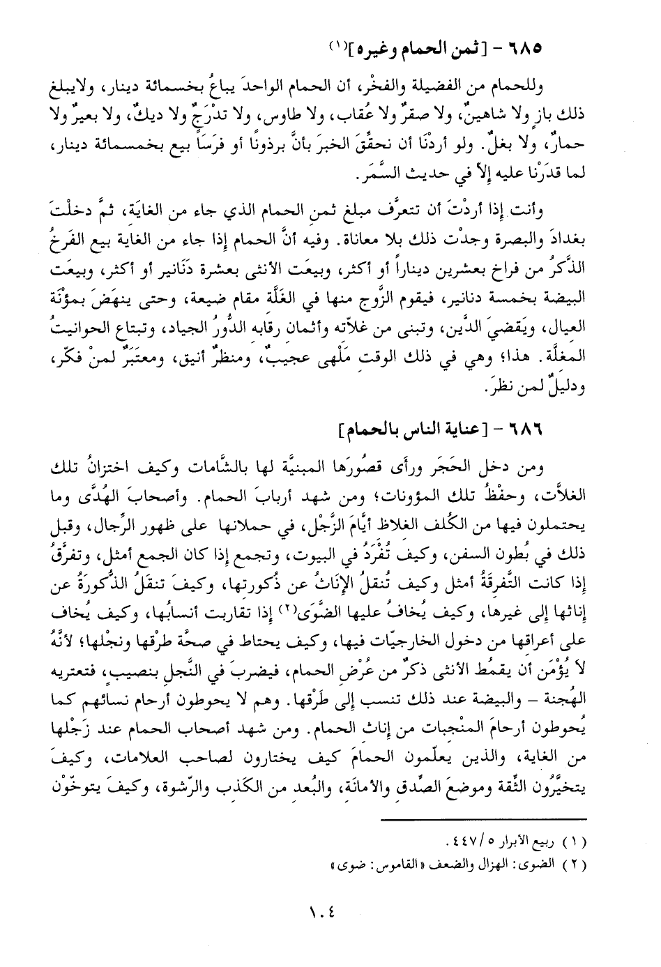 وأنت إذا أردت أن تتعرّف مبلغ ثمن الحمام الذي جاء من الغاية، ثمّ دخلت بغداد والبصرة وجدت ذلك بلا معاناة. وفيه أنّ الحمام إذا جاء من الغاية بيع الفرخ الذّكر من فراخ بعشرين دينارا أو أكثر، وبيعت الأنثى بعشرة دنانير أو أكثر، وبيعت البيضة بخمسة دنانير، فيقوم الزّوج منها في الغلّة مقام ضيعة، وحتى ينهض بمؤنة العيال، ويقضي الدّين، وتبنى من غلّاته وأثمان رقابه الدّور الجياد، وتبتاع الحوانيت المغلّة. هذا؛ وهي في ذلك الوقت ملهى عجيب، ومنظر أنيق، ومعتبر لمن فكّر، ودليل لمن نظر.