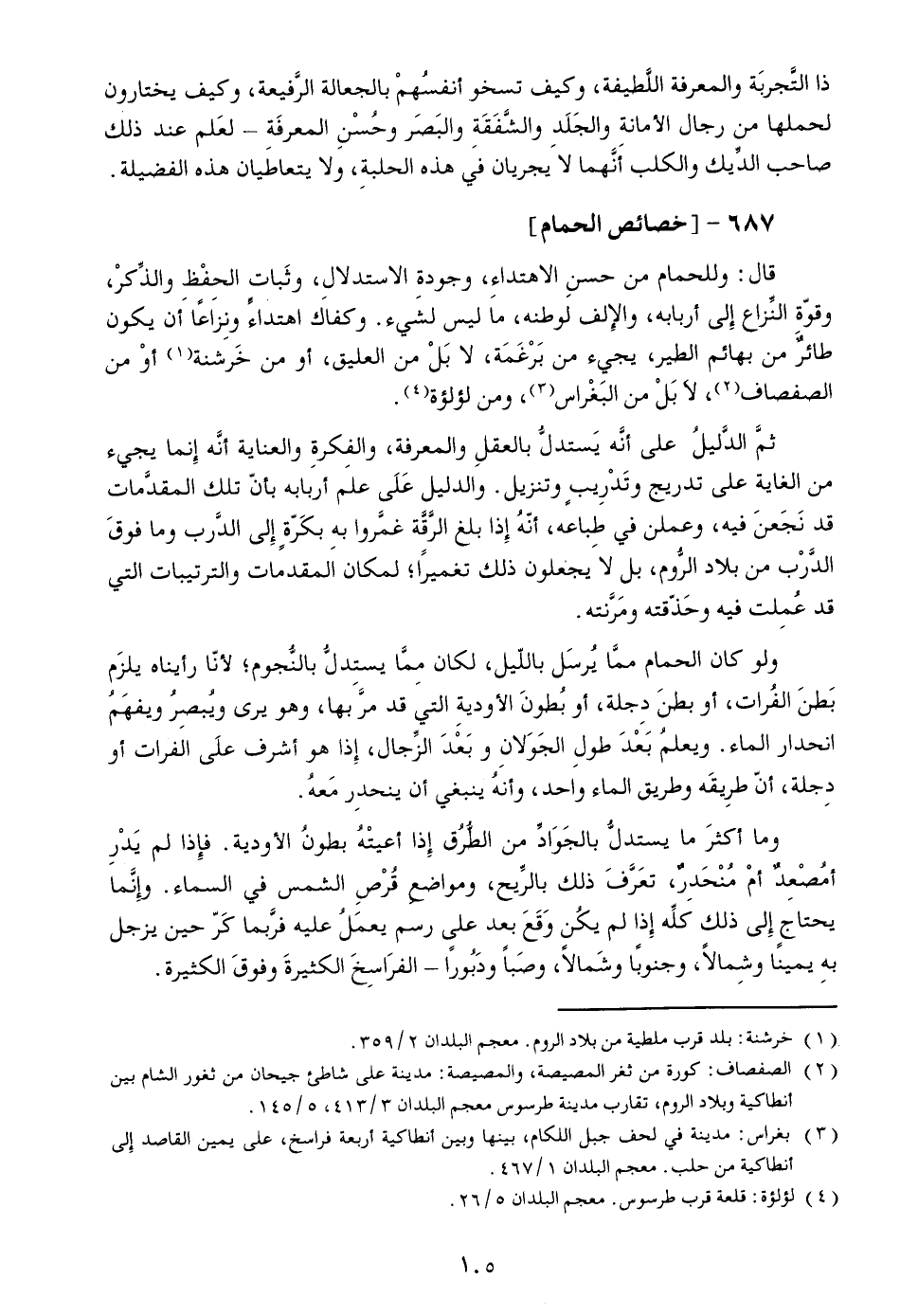 قال: وللحمام من حسن الاهتداء، وجودة الاستدلال، وثبات الحفظ والذّكر، وقوّة النّزاع إلى أربابه، والإلف لوطنه، ما ليس لشيء. وكفاك اهتداء ونزاعا أن يكون طائر من بهائم الطير، يجيء من برغمة، لا بل من العليق، أو من خرشنة [1] أو من الصفصاف [2] ، لا بل من البغراس [3] ، ومن لؤلؤة [4] .