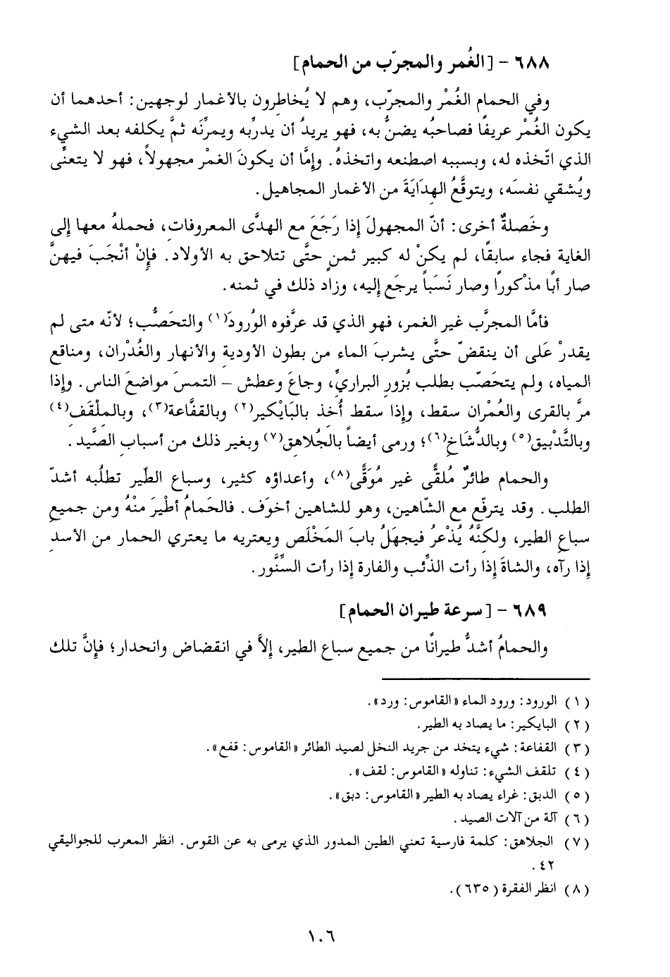 فأمّا المجرّب غير الغمر، فهو الذي قد عرّفوه الورود [1] والتحصّب؛ لأنّه متى لم يقدر على أن ينقضّ حتّى يشرب الماء من بطون الأودية والأنهار والغدران، ومناقع المياه، ولم يتحصّب بطلب بزور البراريّ، وجاع وعطش- التمس مواضع الناس. وإذا مرّ بالقرى والعمران سقط، وإذا سقط أخذ بالبايكير [2] وبالقفّاعة [3] ، وبالملقف [4] وبالتّدبيق [5] وبالدّشاخ [6] ؛ ورمى أيضا بالجلاهق [7] وبغير ذلك من أسباب الصّيد.