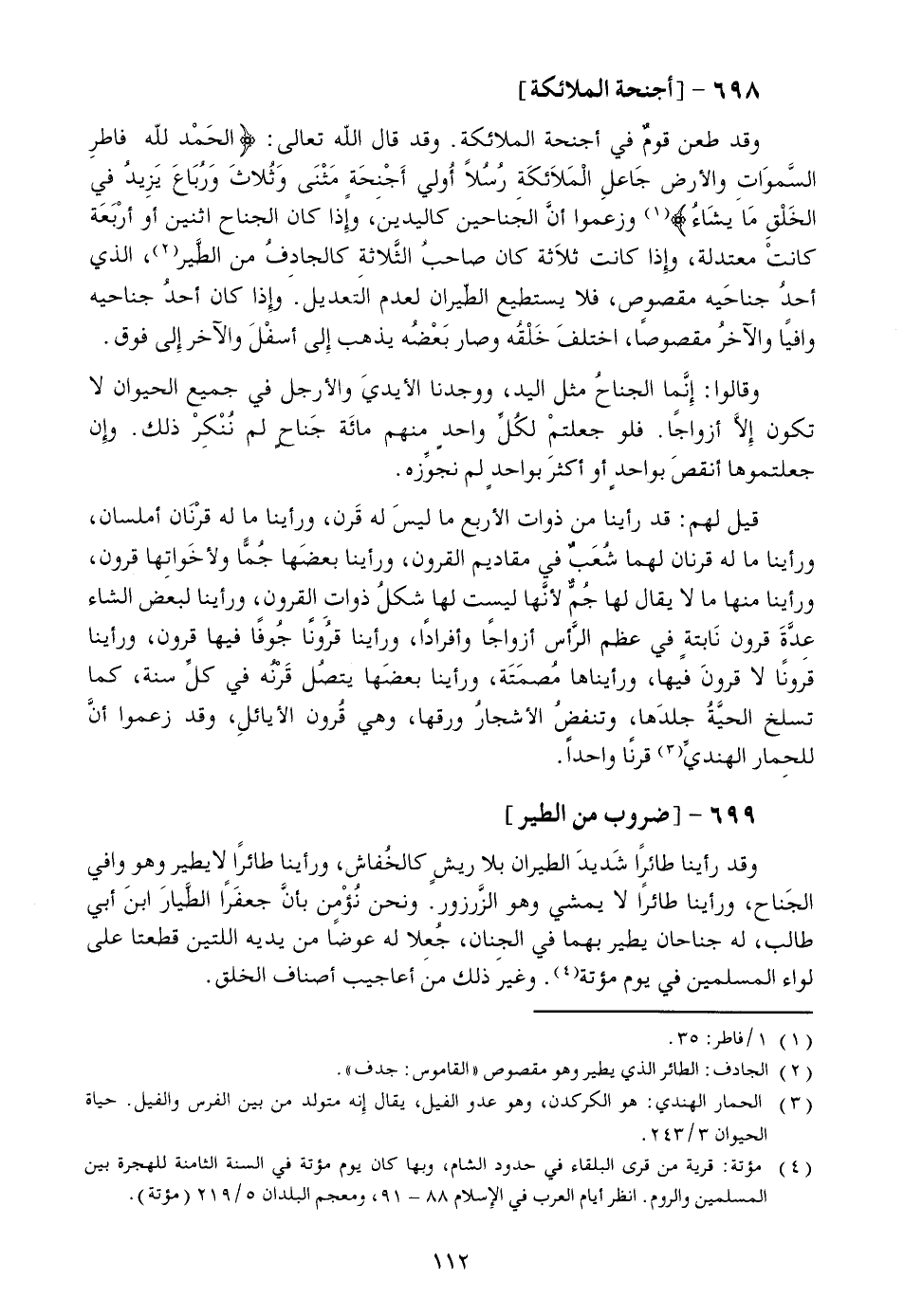 وقد رأينا طائرا شديد الطيران بلا ريش كالخفاش، ورأينا طائرا لا يطير وهو وافي الجناح، ورأينا طائرا لا يمشي وهو الزّرزور. ونحن نؤمن بأنّ جعفرا الطّيار ابن أبي طالب، له جناحان يطير بهما في الجنان، جعلا له عوضا من يديه اللتين قطعتا على لواء المسلمين في يوم مؤتة [4] . وغير ذلك من أعاجيب أصناف الخلق.