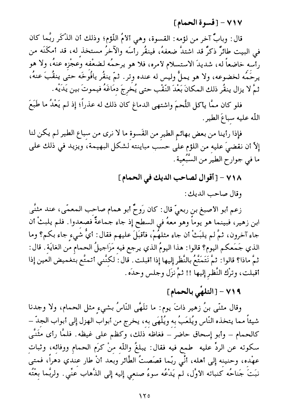 فإذا رأينا من بعض بهائم الطير من القسوة ما لا نرى من سباع الطير لم يكن لنا إلّا أن نقضي عليه من اللؤم على حسب مباينته لشكل البهيمة، ويزيد في ذلك على ما في جوارح الطير من السّبعية.