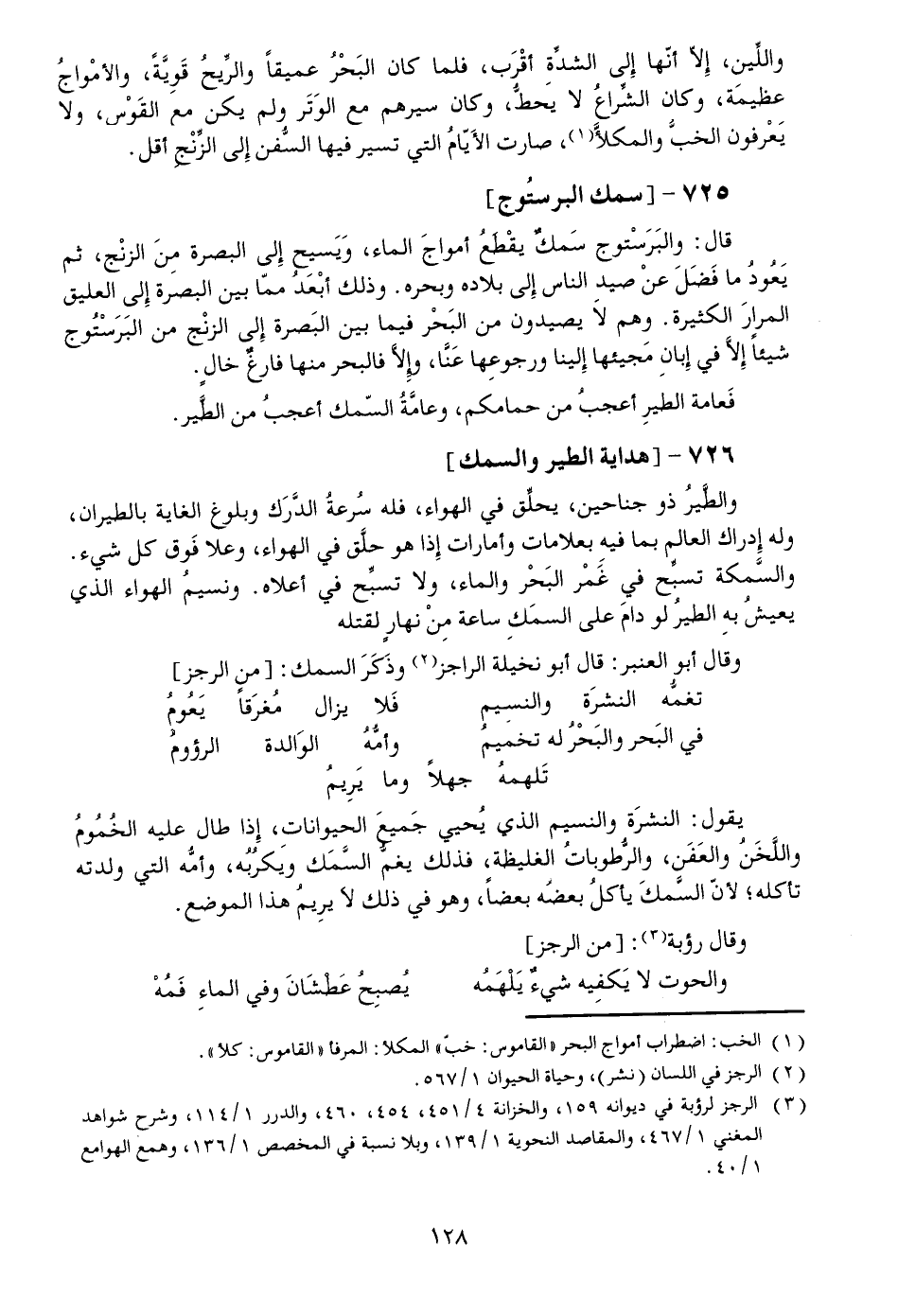 والسّمكة تسبّح في غمر البحر والماء، ولا تسبّح في أعلاه. ونسيم الهواء الذي يعيش به الطير لو دام على السمك ساعة من نهار لقتله وقال أبو العنبر: قال أبو نخيلة الراجز [2] وذكر السمك: [من الرجز]