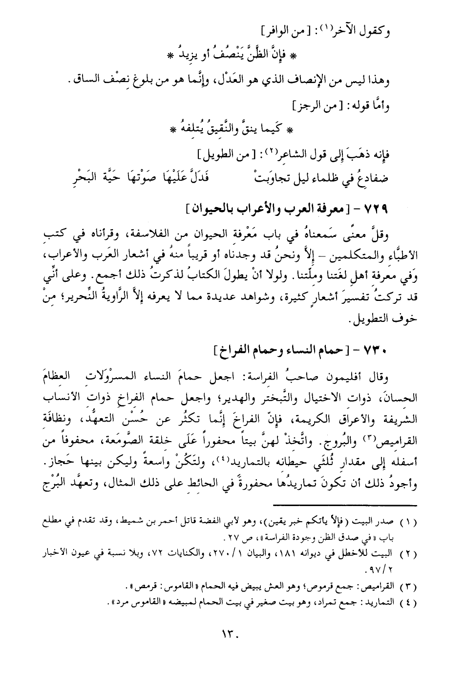 وقلّ معنى سمعناه في باب معرفة الحيوان من الفلاسفة، وقرأناه في كتب الأطبّاء والمتكلمين- إلّا ونحن قد وجدناه أو قريبا منه في أشعار العرب والأعراب، وفي معرفة أهل لغتنا وملّتنا. ولولا أن يطول الكتاب لذكرت ذلك أجمع. وعلى أنّي قد تركت تفسير أشعار كثيرة، وشواهد عديدة مما لا يعرفه إلّا الرّواية النّحرير؛ من خوف التطويل.