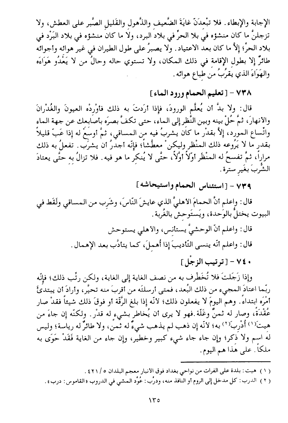 وإذا زجلت فلا تخطرف به من نصف الغاية إلى الغاية، ولكن رتّب ذلك؛ فإنّه ربّما اعتاد المجيء من ذلك البعد، فمتى أرسلته من أقرب منه تحيّر، وأراد أن يبتدئ أمره ابتداء. وهم اليوم لا يفعلون ذلك؛ لأنّه إذا بلغ الرّقّة أو فوق ذلك شيئا فقد صار عقدة، وصار له ثمن وغلّة. فهو لا يرى أن يخاطر بشيء له قدر. ولكنّه إن جاء من هيت [1] أدرب [2] به؛ لأنّه إن ذهب لم يذهب شيء له ثمن، ولا طائر له رياسة؛ وليس له اسم ولا ذكر؛ وإن جاء جاء شيء كبير وخطير، وإن جاء من الغاية فقد حوى به ملكا. على هذا هم اليوم.
