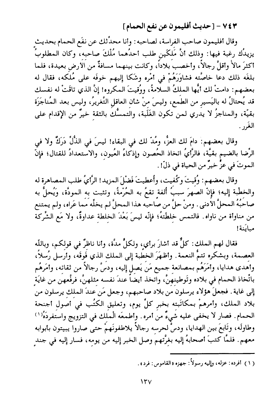 وقال أفليمون صاحب الفراسة، لصاحبه: وأنا محدّثك عن نفع الحمام بحديث يزيدك رغبة فيها: وذلك أنّ ملكين طلب أحدهما ملك صاحبه، وكان المطلوب أكثر مالا وأقلّ رجالا، وأخصب بلادا، وكانت بينهما مسافة من الأرض بعيدة، فلما بلغه ذلك دعا خاصّته فشاورهم في أمره وشكا إليهم خوفه على ملكه، فقال له بعضهم: دامت لك أيّها الملك السلامة، ووقيت المكروه! إنّ الذي تاقت له نفسك قد يحتال له باليسير من الطمع، وليس من شأن العاقل التّغرير، وليس بعد المناجزة بقيّة، والمناجز لا يدري لمن تكون الغلبة، والتمسّك بالثقة خير من الإقدام على الغرر.