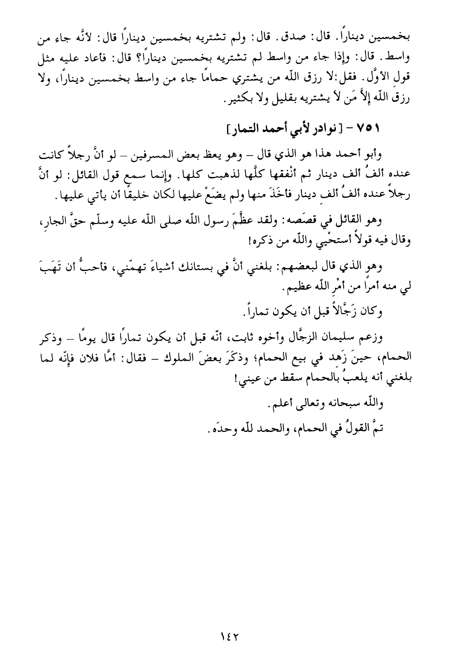 بخمسين دينارا. قال: صدق. قال: ولم تشتريه بخمسين دينارا قال: لأنّه جاء من واسط. قال: وإذا جاء من واسط لم تشتريه بخمسين دينارا؟ قال: فأعاد عليه مثل قول الأوّل. فقل: لا رزق الله من يشتري حماما جاء من واسط بخمسين دينارا، ولا رزق الله إلّا من لا يشتريه بقليل ولا بكثير.