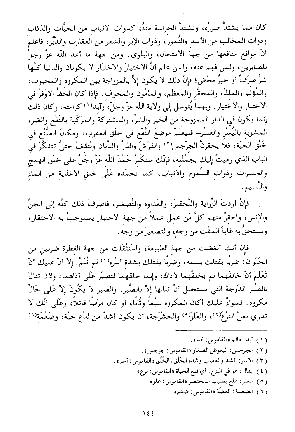 فإن أنت أبغضت من جهة الطبيعة، واستثقلت من جهة الفطرة ضربين من الحيوان: ضربا يقتلك بسمه، وضربا يقتلك بشدة أسره [3] لم تلم. إلّا أنّ عليك أن تعلم أنّ خالقهما لم يخلقهما لأذاك، وإنما خلقهما لتصبر على أذاهما، ولأن تنال بالصّبر الدرجة التي يستحيل أن تنالها إلّا بالصّبر. والصبر لا يكون إلّا على حالّ مكروه. فسواء عليك أكان المكروه سبعا وثّابا، أو كان مرضا قاتلا، وعلى أنّك لا تدري لعلّ النزع [4] ، والعلز [5] والحشرجة، أن يكون أشدّ من لدغ حيّة، وضغمة [6]