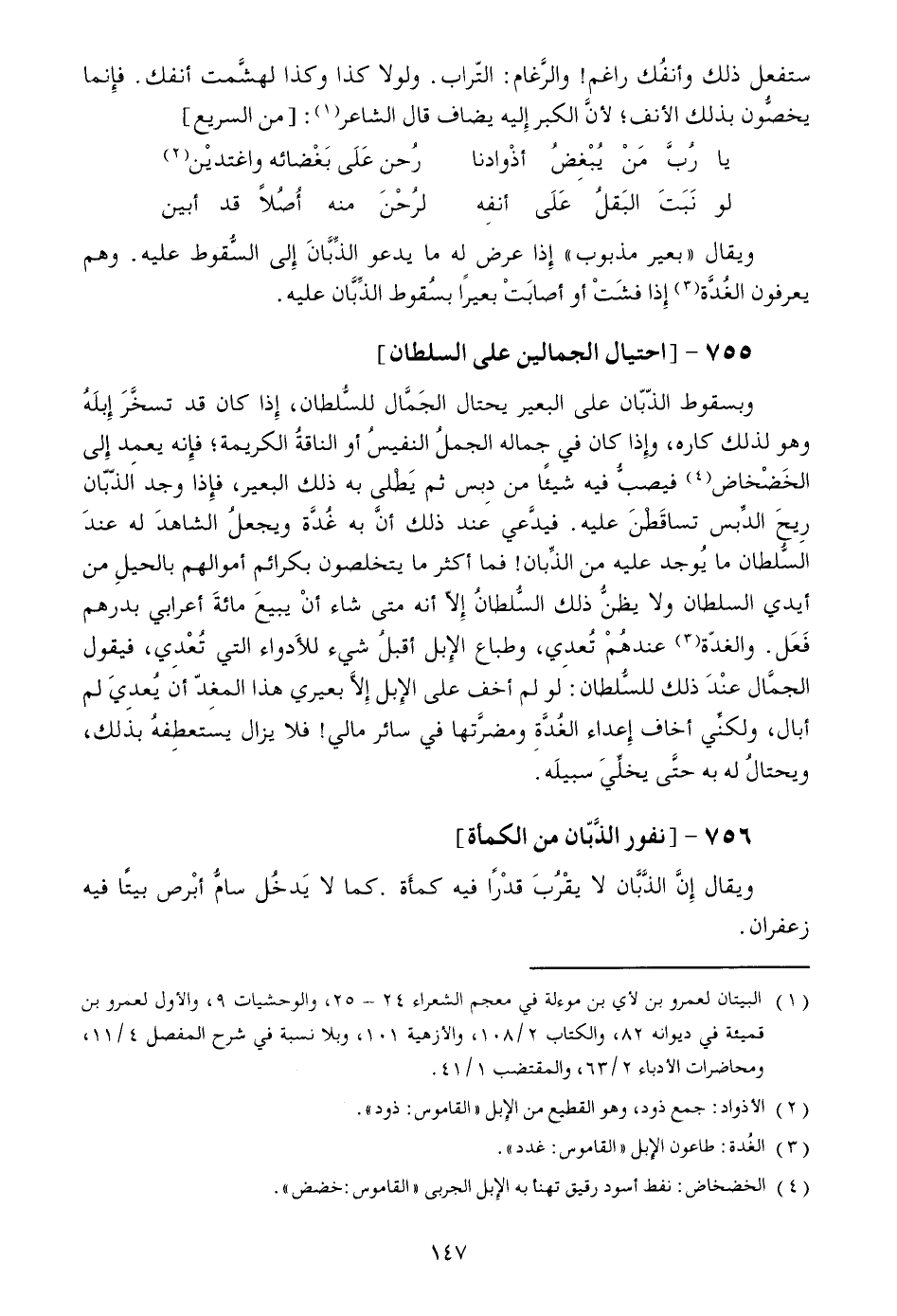 وبسقوط الذّبّان على البعير يحتال الجمّال للسّلطان، إذا كان قد تسخّر إبله وهو لذلك كاره، وإذا كان في جماله الجمل النفيس أو الناقة الكريمة؛ فإنه يعمد إلى الخضخاض [4] فيصبّ فيه شيئا من دبس ثم يطلى به ذلك البعير، فإذا وجد الذّبّان ريح الدّبس تساقطن عليه. فيدّعي عند ذلك أنّ به غدّة ويجعل الشاهد له عند السّلطان ما يوجد عليه من الذّبان! فما أكثر ما يتخلصون بكرائم أموالهم بالحيل من أيدي السلطان ولا يظنّ ذلك السّلطان إلّا أنه متى شاء أن يبيع مائة أعرابي بدرهم فعل. والغدّة [3] عندهم تعدي، وطباع الإبل أقبل شيء للأدواء التي تعدي، فيقول الجمّال عند ذلك للسّلطان: لو لم أخف على الإبل إلّا بعيري هذا المغدّ أن يعدي لم أبال، ولكنّي أخاف إعداء الغدّة ومضرّتها في سائر مالي! فلا يزال يستعطفه بذلك، ويحتال له به حتّى يخلّي سبيله.
