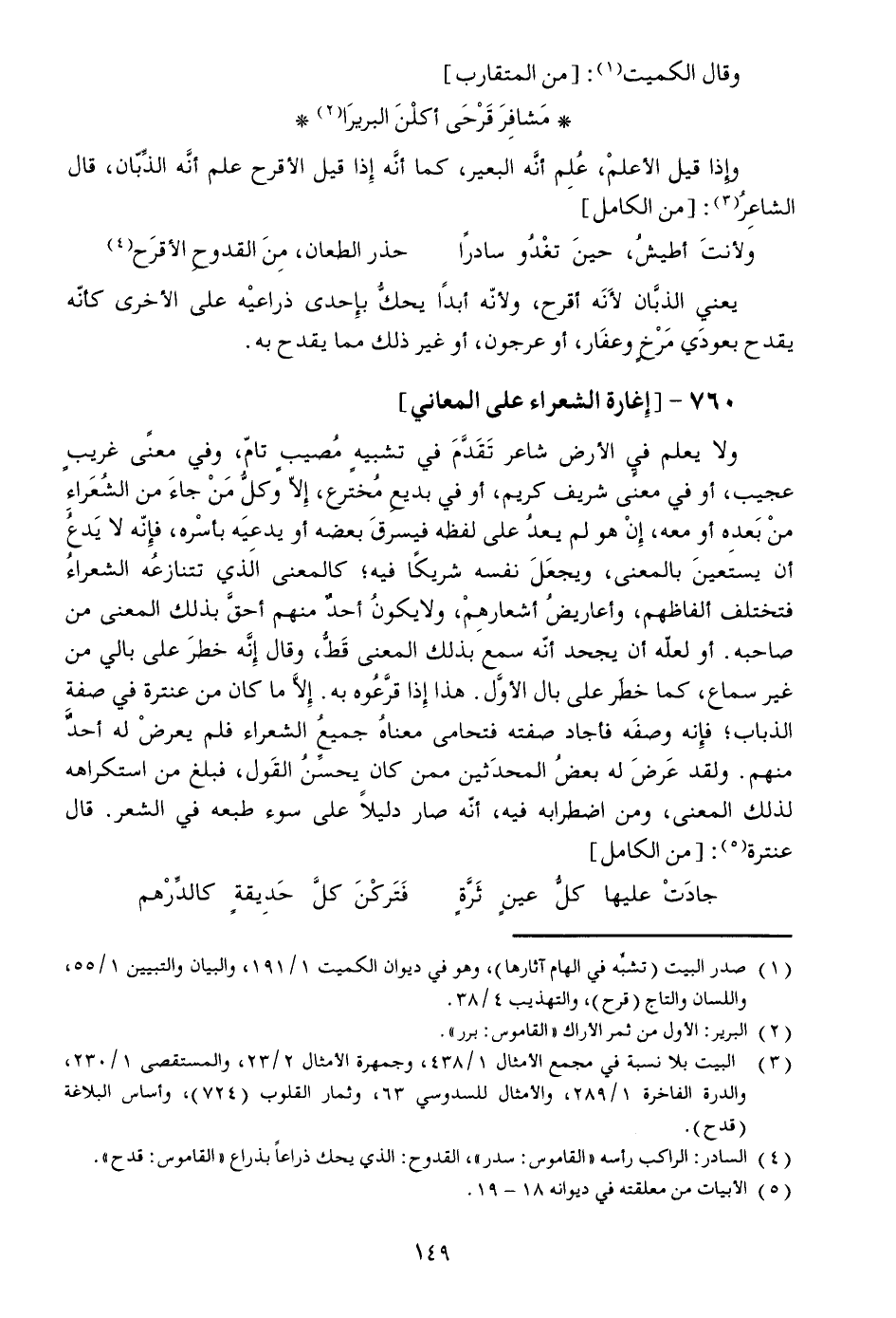 [1] صدر البيت (تشبّه في الهام آثارها) ، وهو في ديوان الكميت 1/191، والبيان والتبيين 1/55، واللسان والتاج (قرح) ، والتهذيب 4/38.