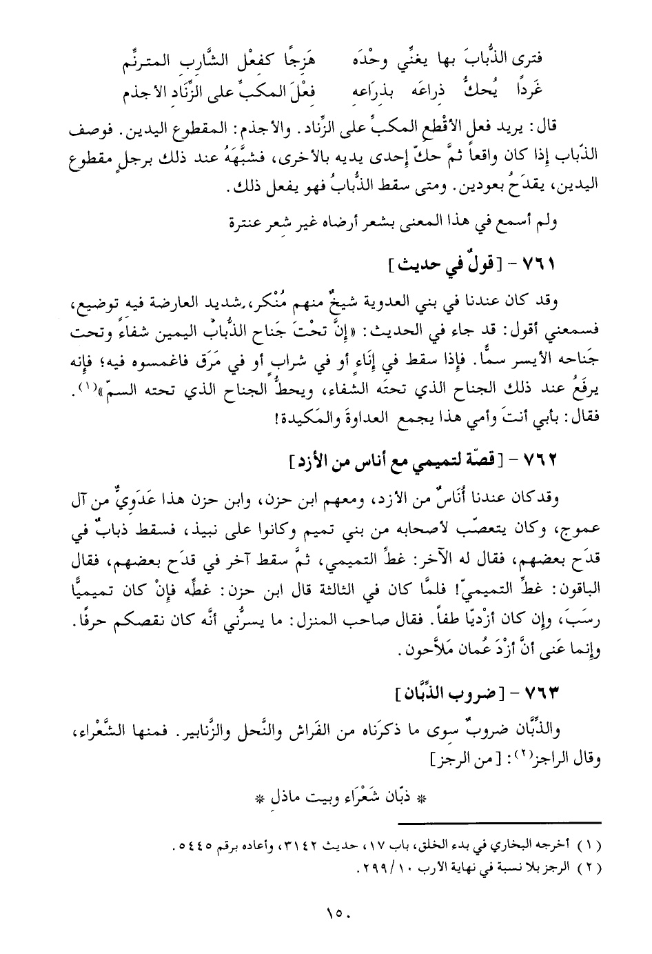 وقد كان عندنا في بني العدوية شيخ منهم منكر، شديد العارضة فيه توضيع، فسمعني أقول: قد جاء في الحديث: «إنّ تحت جناح الذّباب اليمين شفاء وتحت جناحه الأيسر سمّا. فإذا سقط في إناء أو في شراب أو في مرق فاغمسوه فيه؛ فإنه يرفع عند ذلك الجناح الذي تحته الشفاء، ويحطّ الجناح الذي تحته السمّ» [1] .