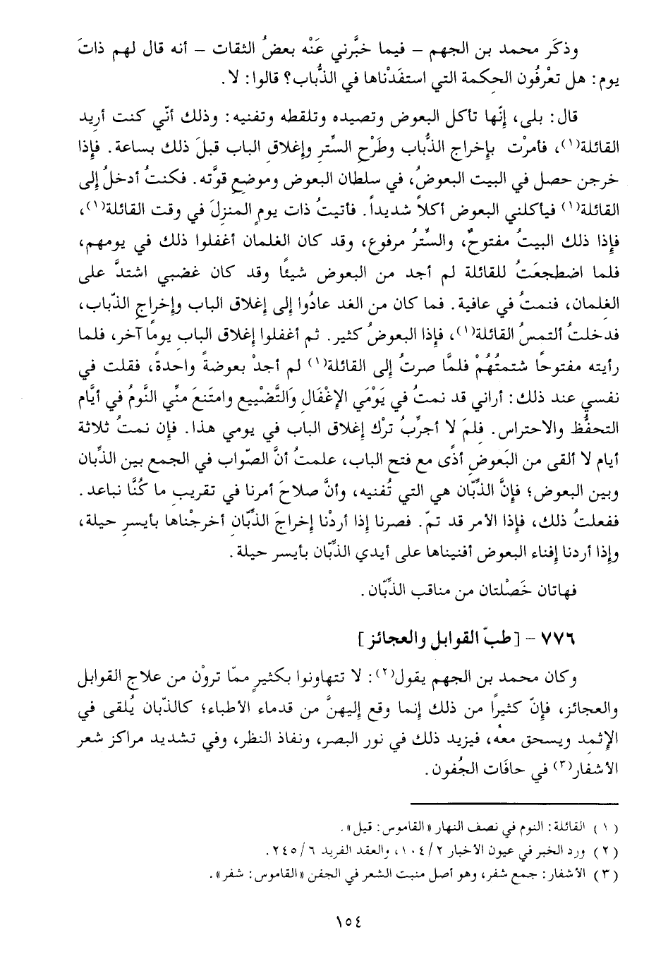 وكان محمد بن الجهم يقول [2] : لا تتهاونوا بكثير ممّا ترون من علاج القوابل والعجائز، فإنّ كثيرا من ذلك إنما وقع إليهنّ من قدماء الأطباء؛ كالذّبان يلقى في الإثمد ويسحق معه، فيزيد ذلك في نور البصر، ونفاذ النظر، وفي تشديد مراكز شعر الأشفار [3] في حافات الجفون.