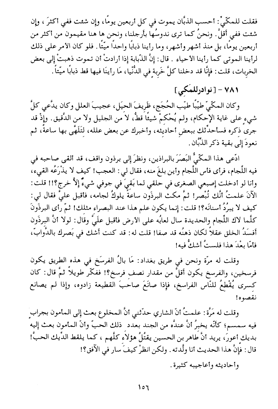 وكان المكّيّ طيّبا طيّب الحجج، ظريف الحيل، عجيب العلل وكان يدّعي كلّ شيء على غاية الإحكام، ولم يحكم شيئا قطّ، لا من الجليل ولا من الدّقيق. وإذ قد جرى ذكره فسأحدّثك ببعض أحاديثه، وأخبرك عن بعض علله، لتلهّى بها ساعة، ثم نعود إلى بقية ذكر الذّبّان.