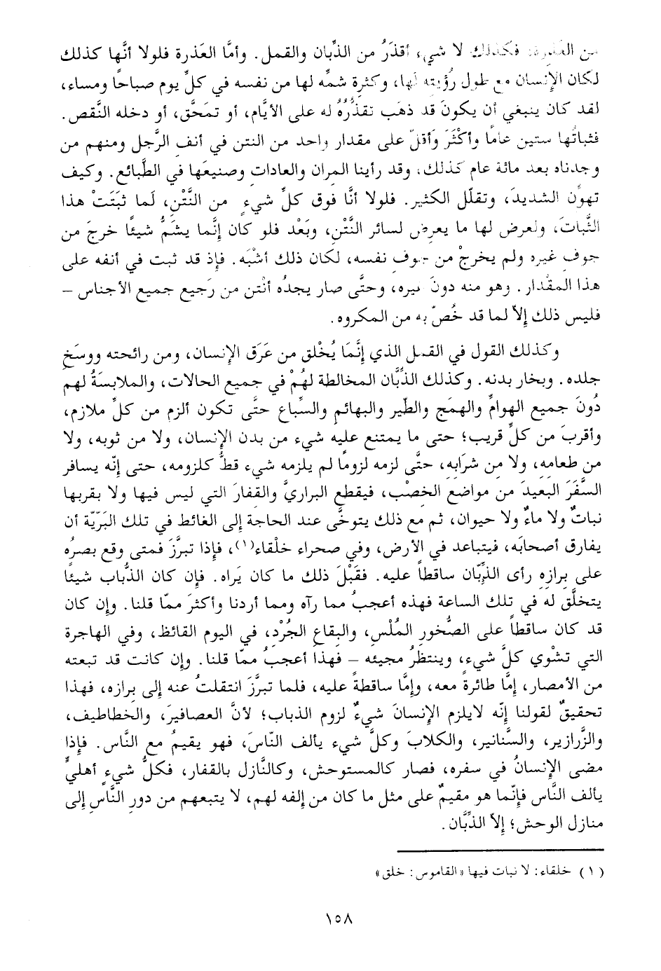 وكذلك القول في القمل الذي إنّما يخلق من عرق الإنسان، ومن رائحته ووسخ جلده. وبخار بدنه. وكذلك الذّبّان المخالطة لهم في جميع الحالات، والملابسة لهم دون جميع الهوامّ والهمج والطّير والبهائم والسّباع حتّى تكون ألزم من كلّ ملازم، وأقرب من كلّ قريب؛ حتى ما يمتنع عليه شيء من بدن الإنسان، ولا من ثوبه، ولا من طعامه، ولا من شرابه، حتّى لزمه لزوما لم يلزمه شيء قطّ كلزومه، حتى إنّه يسافر السّفر البعيد من مواضع الخصب، فيقطع البراريّ والقفار التي ليس فيها ولا بقربها نبات ولا ماء ولا حيوان، ثم مع ذلك يتوخّى عند الحاجة إلى الغائط في تلك البرّية أن يفارق أصحابه، فيتباعد في الأرض، وفي صحراء خلقاء [1] ، فإذا تبرّز فمتى وقع بصره على برازه رأى الذّبّان ساقطا عليه. فقبل ذلك ما كان يراه. فإن كان الذّباب شيئا يتخلّق له في تلك الساعة فهذه أعجب مما رآه ومما أردنا وأكثر ممّا قلنا. وإن كان قد كان ساقطا على الصّخور الملس، والبقاع الجرد، في اليوم القائظ، وفي الهاجرة التي تشوي كلّ شيء، وينتظر مجيئه- فهذا أعجب ممّا قلنا. وإن كانت قد تبعته من الأمصار، إمّا طائرة معه، وإمّا ساقطة عليه، فلما تبرّز انتقلت عنه إلى برازه، فهذا تحقيق لقولنا إنّه لا يلزم الإنسان شيء لزوم الذباب؛ لأنّ العصافير، والخطاطيف، والزّرازير، والسّنانير، والكلاب وكلّ شيء يألف النّاس، فهو يقيم مع النّاس. فإذا مضى الإنسان في سفره، فصار كالمستوحش، وكالنّازل بالقفار، فكلّ شيء أهليّ يألف النّاس فإنّما هو مقيم على مثل ما كان من إلفه لهم، لا يتبعهم من دور النّاس إلى منازل الوحش؛ إلّا الذّبّان.