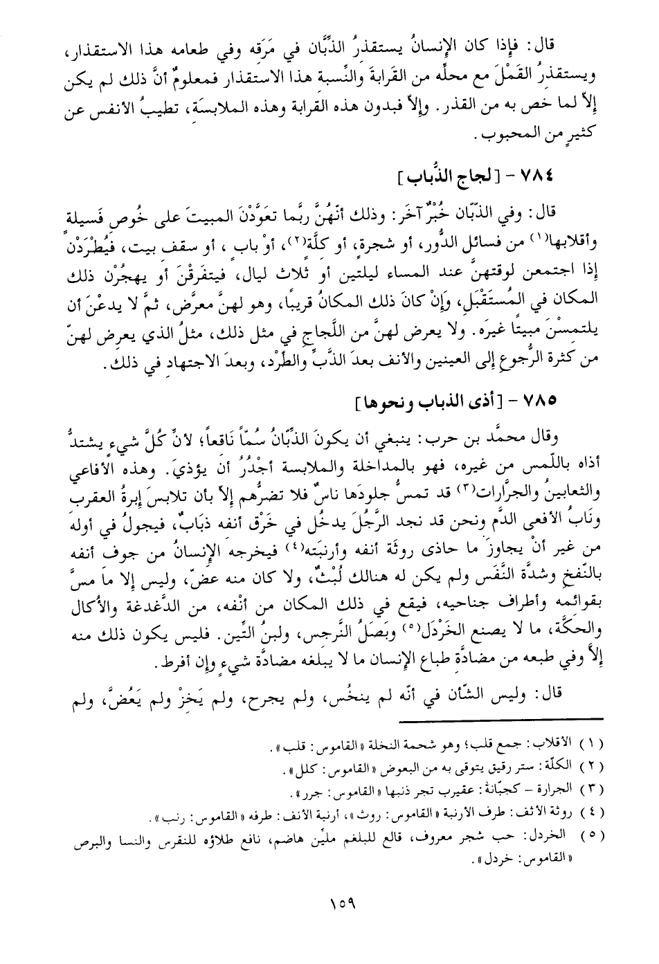 قال: وفي الذّبّان خبر آخر: وذلك أنّهنّ ربّما تعوّدن المبيت على خوص فسيلة وأقلابها [1] من فسائل الدّور، أو شجرة، أو كلّة [2] ، أو باب، أو سقف بيت، فيطردن إذا اجتمعن لوقتهنّ عند المساء ليلتين أو ثلاث ليال، فيتفرقن أو يهجرن ذلك المكان في المستقبل، وإن كان ذلك المكان قريبا، وهو لهنّ معرّض، ثمّ لا يدعن أن يلتمسن مبيتا غيره. ولا يعرض لهنّ من اللّجاج في مثل ذلك، مثل الذي يعرض لهنّ من كثرة الرّجوع إلى العينين والأنف بعد الذّبّ والطّرد، وبعد الاجتهاد في ذلك.