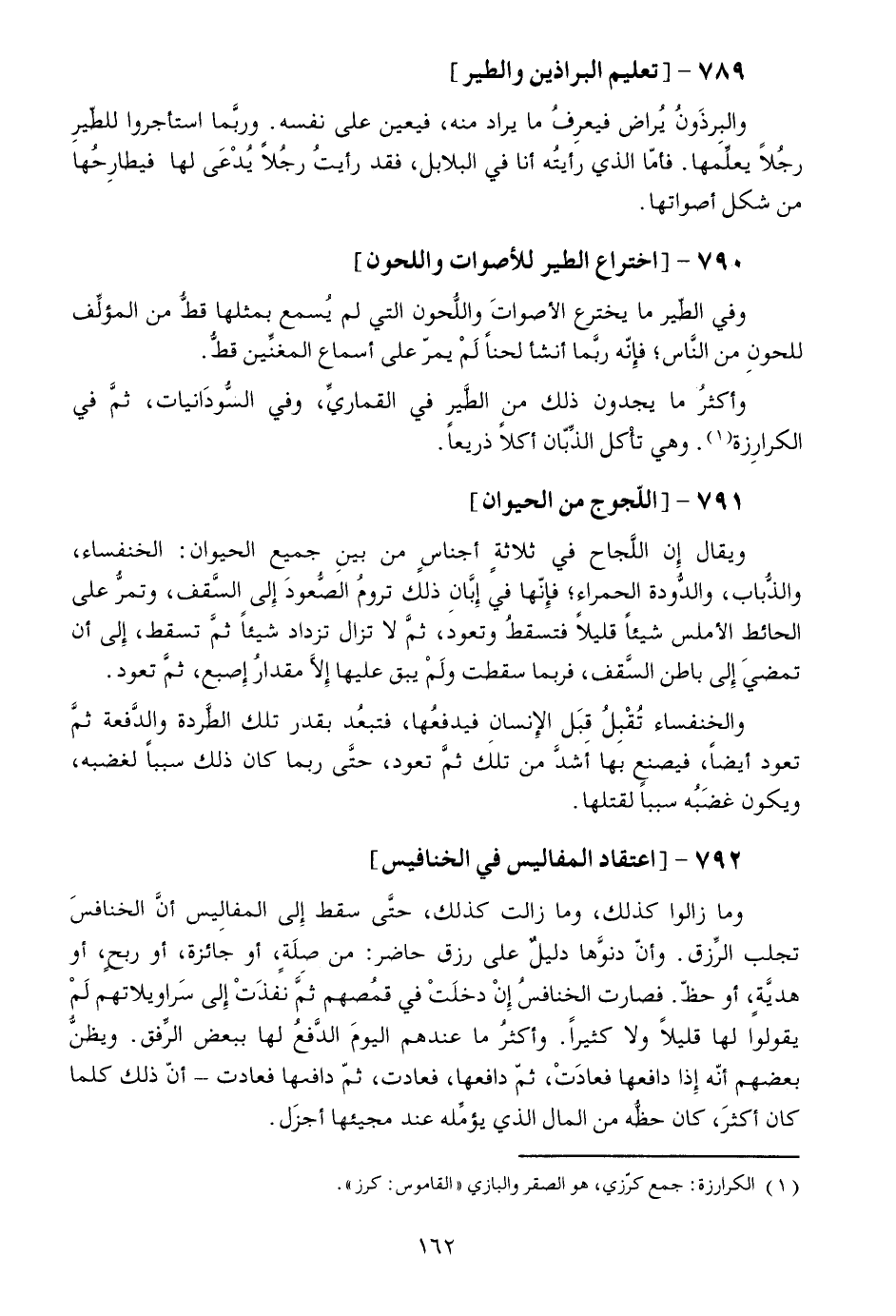 والبرذون يراض فيعرف ما يراد منه، فيعين على نفسه. وربّما استأجروا للطّير رجلا يعلّمها. فأمّا الذي رأيته أنا في البلابل، فقد رأيت رجلا يدعى لها فيطارحها من شكل أصواتها.