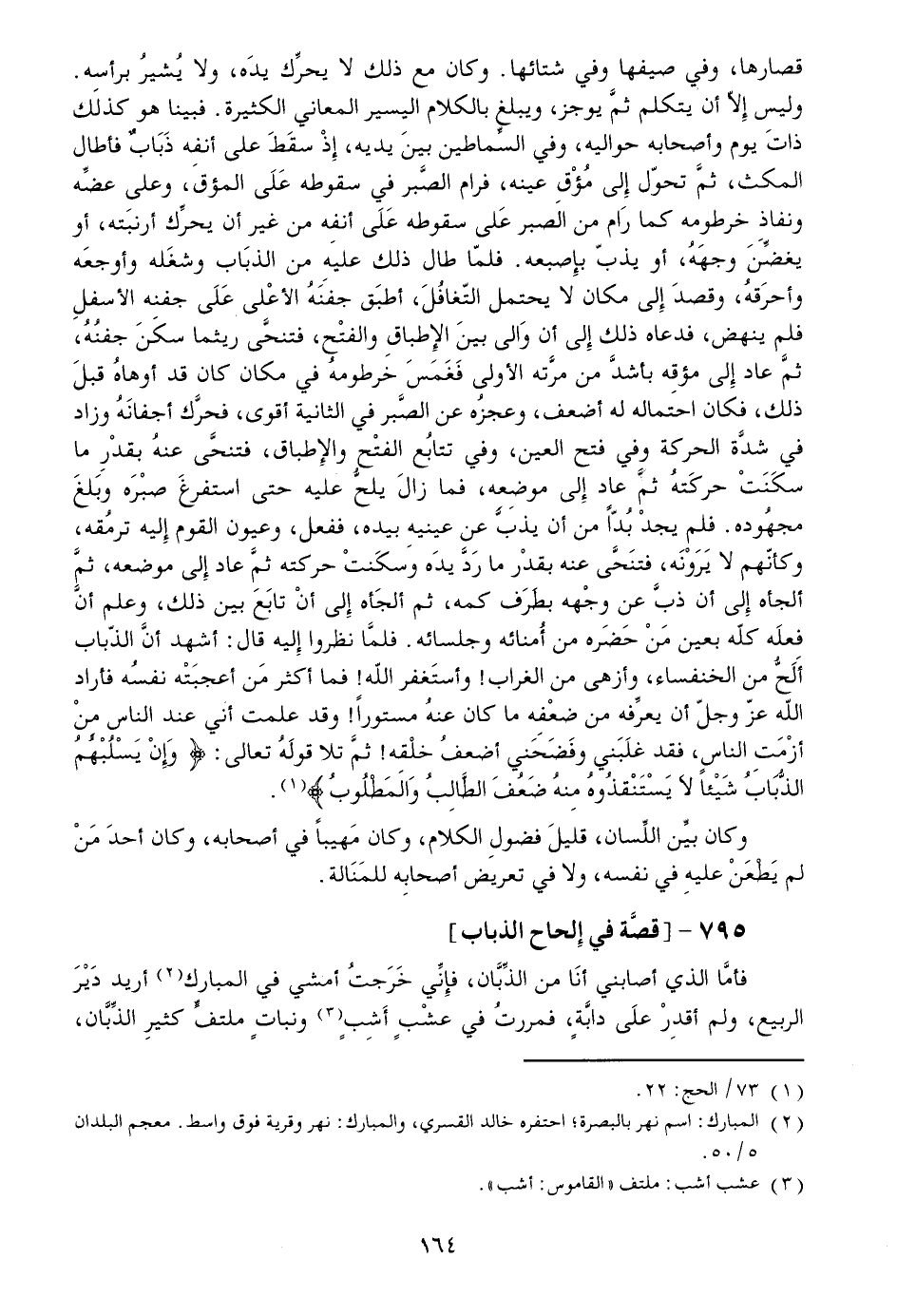 وليس إلّا أن يتكلم ثمّ يوجز، ويبلغ بالكلام اليسير المعاني الكثيرة. فبينا هو كذلك ذات يوم وأصحابه حواليه، وفي السّماطين بين يديه، إذ سقط على أنفه ذباب فأطال المكث، ثمّ تحوّل إلى مؤق عينه، فرام الصّبر في سقوطه على المؤق، وعلى عضّه ونفاذ خرطومه كما رام من الصبر على سقوطه على أنفه من غير أن يحرّك أرنبته، أو يغضّن وجهه، أو يذبّ بإصبعه. فلمّا طال ذلك عليه من الذباب وشغله وأوجعه وأحرقه، وقصد إلى مكان لا يحتمل التّغافل، أطبق جفنه الأعلى على جفنه الأسفل فلم ينهض، فدعاه ذلك إلى أن والى بين الإطباق والفتح، فتنحّى ريثما سكن جفنه، ثمّ عاد إلى مؤقه بأشدّ من مرّته الأولى فغمس خرطومه في مكان كان قد أوهاه قبل ذلك، فكان احتماله له أضعف، وعجزه عن الصّبر في الثانية أقوى، فحرّك أجفانه وزاد في شدّة الحركة وفي فتح العين، وفي تتابع الفتح والإطباق، فتنحّى عنه بقدر ما سكنت حركته ثمّ عاد إلى موضعه، فما زال يلحّ عليه حتى استفرغ صبره وبلغ مجهوده. فلم يجد بدّا من أن يذبّ عن عينيه بيده، ففعل، وعيون القوم إليه ترمقه، وكأنّهم لا يرونه، فتنحّى عنه بقدر ما ردّ يده وسكنت حركته ثمّ عاد إلى موضعه، ثمّ ألجأه إلى أن ذبّ عن وجهه بطرف كمه، ثم ألجأه إلى أن تابع بين ذلك، وعلم أنّ فعله كلّه بعين من حضره من أمنائه وجلسائه. فلمّا نظروا إليه قال: أشهد أنّ الذّباب ألحّ من الخنفساء، وأزهى من الغراب! وأستغفر الله! فما أكثر من أعجبته نفسه فأراد الله عزّ وجلّ أن يعرّفه من ضعفه ما كان عنه مستورا! وقد علمت أني عند الناس من أزمت الناس، فقد غلبني وفضحني أضعف خلقه! ثمّ تلا قوله تعالى: وَإِنْ يَسْلُبْهُمُ الذُّبابُ شَيْئاً لا يَسْتَنْقِذُوهُ مِنْهُ ضَعُفَ الطَّالِبُ وَالْمَطْلُوبُ