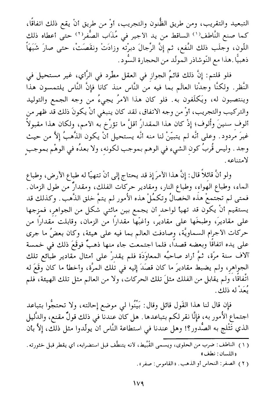 فلو قلتم: إنّ ذلك قائم الجواز في العقل مطّرد في الرّأي، غير مستحيل في النّظر. ولكنّا وجدنا العالم بما فيه من النّاس منذ كانا فإنّ النّاس يلتمسون هذا وينتصبون له، ويكلفون به. فلو كان هذا الأمر يجيء من وجه الجمع والتوليد والتركيب والتجريب، أو من وجه الاتفاق، لقد كان ينبغي أن يكون ذلك قد ظهر من ألوف سنين وألوف؛ إذ كان هذا المقدار أقلّ ما تؤرّخ به الأمم، ولكان هذا مقبولا غير مردود. وعلى أنّه لم يتبيّن لنا منه أنّه يستحيل أن يكون الذّهب إلّا من حيث وجد. وليس قرب كون الشيء في الوهم بموجب لكونه، ولا بعده في الوهم بموجب لامتناعه.