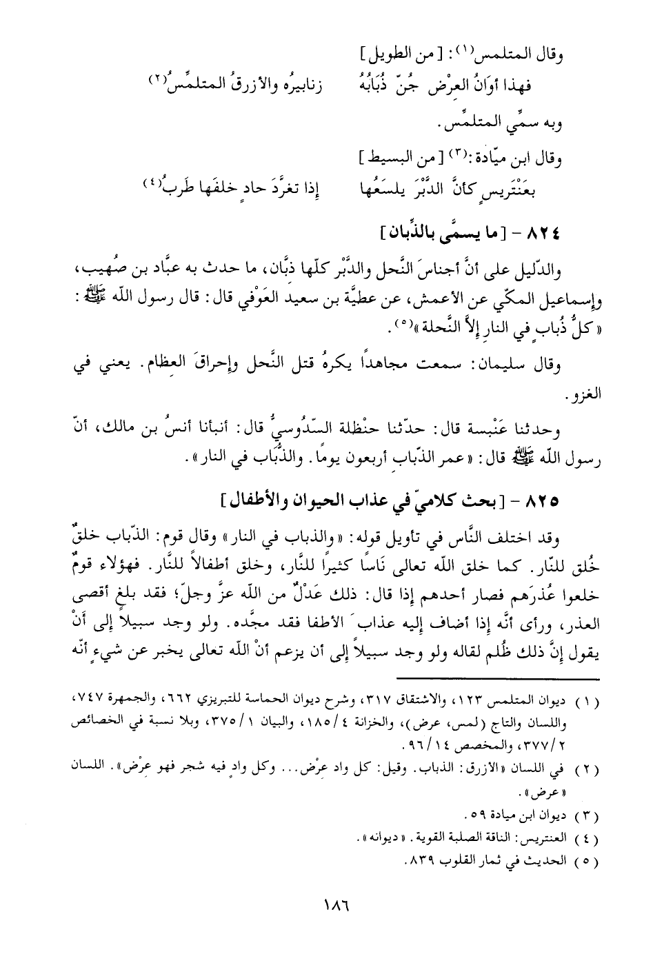 وقد اختلف النّاس في تأويل قوله: «والذباب في النار» وقال قوم: الذّباب خلق خلق للنّار. كما خلق الله تعالى ناسا كثيرا للنّار، وخلق أطفالا للنّار. فهؤلاء قوم خلعوا عذرهم فصار أحدهم إذا قال: ذلك عدل من الله عزّ وجلّ؛ فقد بلغ أقصى العذر، ورأى أنّه إذا أضاف إليه عذاب الأطفا فقد مجّده. ولو وجد سبيلا إلى أن يقول إنّ ذلك ظلم لقاله ولو وجد سبيلا إلى أن يزعم أن الله تعالى يخبر عن شيء أنّه