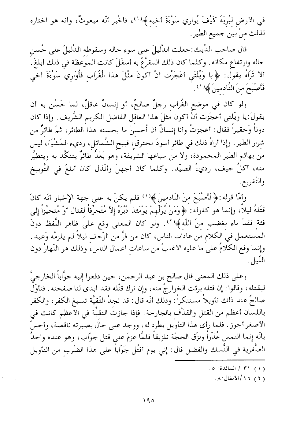 ولو كان في موضع الغراب رجل صالح، أو إنسان عاقل، لما حسن به أن يقول: يا ويلتى أعجزت أن أكون مثل هذا العاقل الفاضل الكريم الشّريف. وإذا كان دونا وحقيرا فقال: أعجزت وأنا إنسان أن أحسن ما يحسنه هذا الطائر، ثمّ طائر من شرار الطير. وإذا أراه ذلك في طائر أسود محترق، قبيح الشّمائل، رديء المشية، ليس من بهائم الطير المحمودة، ولا من سباعها الشريفة، وهو بعد طائر يتنكّد به ويتطيّر منه، آكل جيف، رديء الصيّد. وكلما كان أجهل وأنذل كان أبلغ في التّوبيخ والتّقريع.