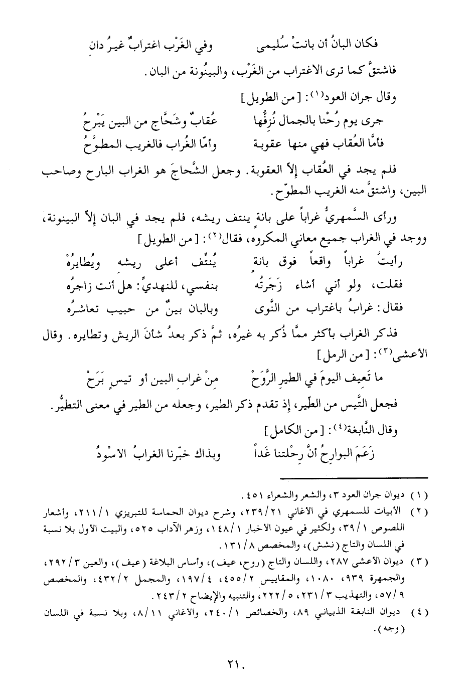 ورأى السّمهريّ غرابا على بانة ينتف ريشه، فلم يجد في البان إلّا البينونة، ووجد في الغراب جميع معاني المكروه، فقال [2] : [من الطويل]