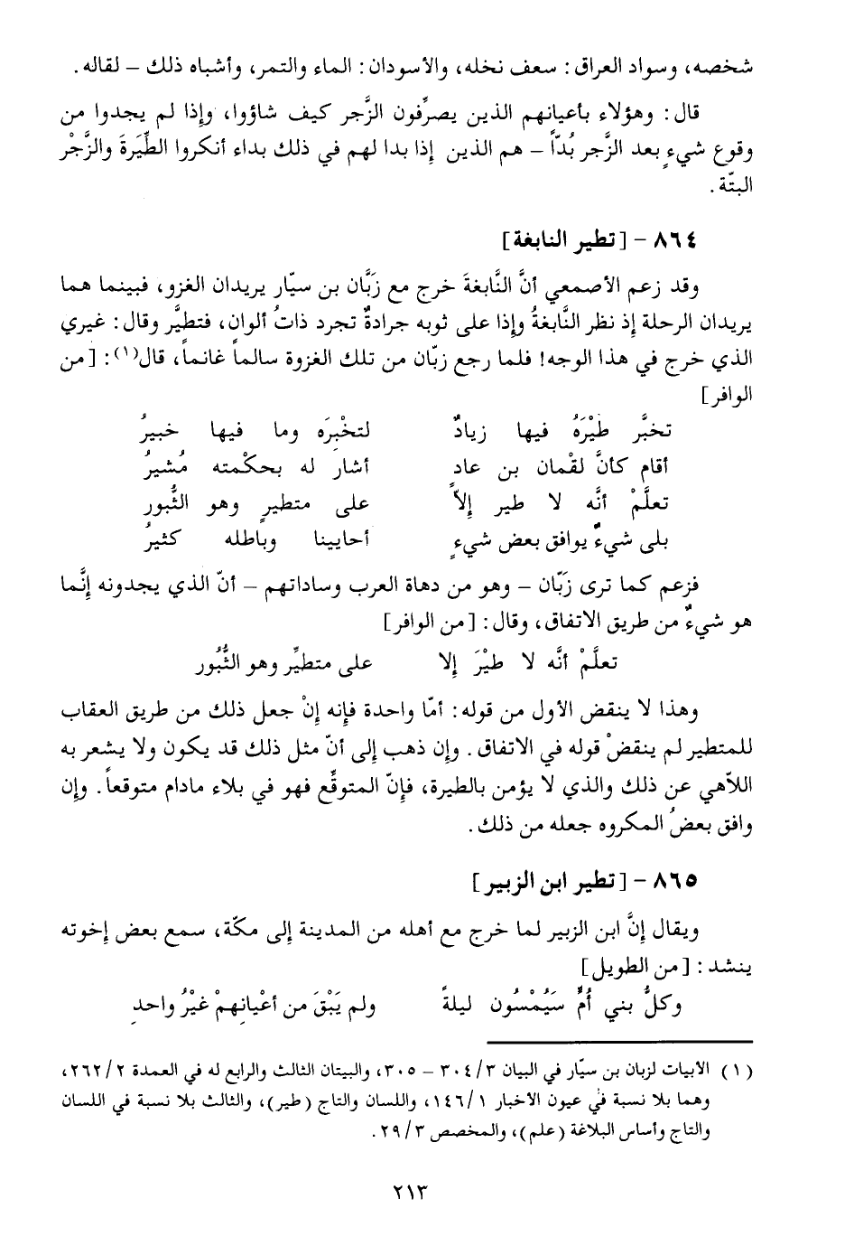 [1] الأبيات لزبان بن سيّار في البيان 3/304- 305، والبيتان الثالث والرابع له في العمدة 2/262، وهما بلا نسبة في عيون الأخبار 1/146، واللسان والتاج (طير) ، والثالث بلا نسبة في اللسان والتاج وأساس البلاغة (علم) ، والمخصص 3/29.