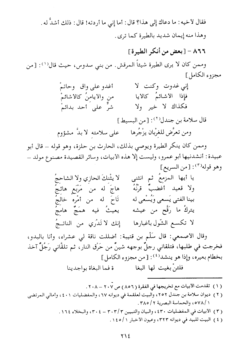 وممن كان لا يرى الطيرة شيئا المرقش. من بني سدوس، حيث قال [1] : [من مجزوء الكامل]
