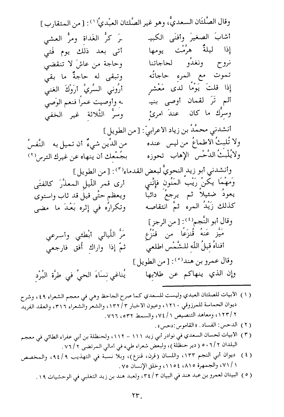 [1] الأبيات للصلتان العبدي وليست للسعدي كما صرح الجاحظ وهي في معجم الشعراء 49، وشرح ديوان الحماسة للمرزوقي 1210، وعيون الأخبار 3/132، والشعر والشعراء 316، والعقد الفريد 2/123، ومعاهد التنصيص 1/74، والسمط 532، 766.