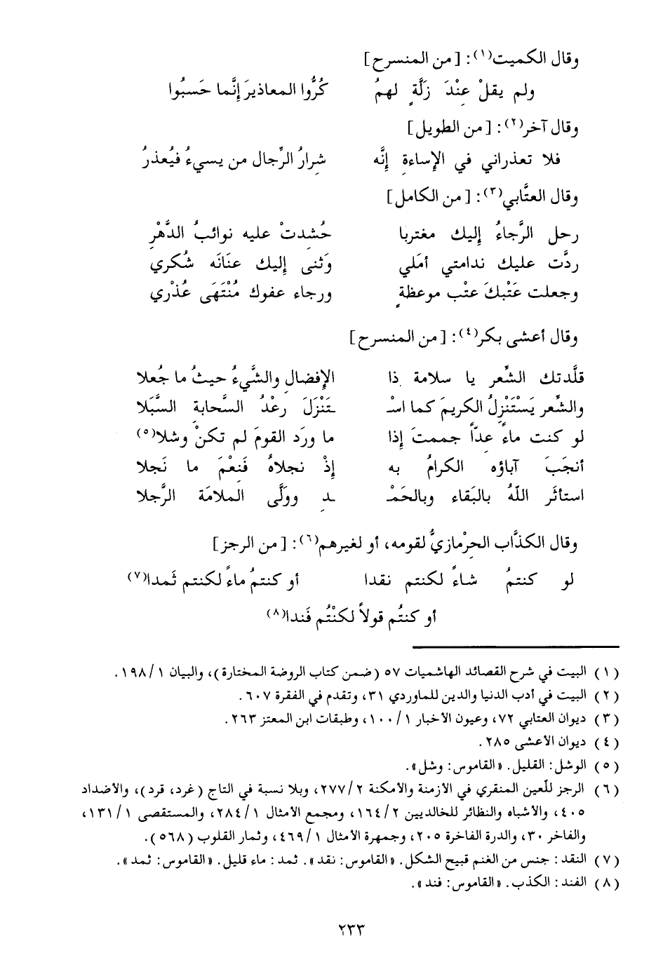 ولم يقل عند زلّة لهم ... كرّوا المعاذير إنّما حسبوا