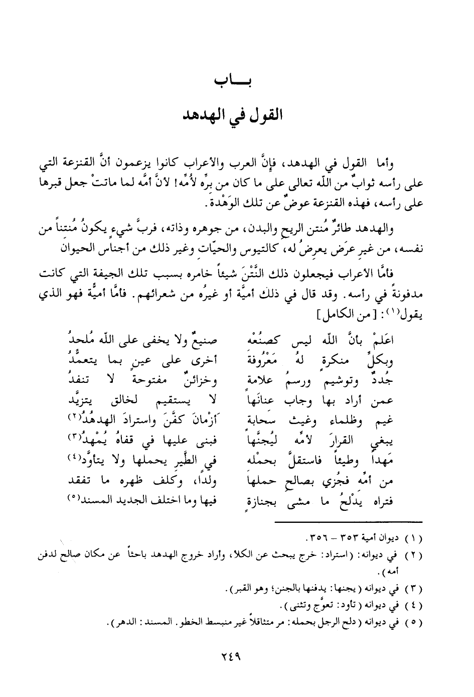 والهدهد طائر منتن الريح والبدن، من جوهره وذاته، فربّ شيء يكون منتنا من نفسه، من غير عرض يعرض له، كالتيوس والحيّات وغير ذلك من أجناس الحيوان فأمّا الأعراب فيجعلون ذلك النّتن شيئا خامره بسبب تلك الجيفة التي كانت مدفونة في رأسه. وقد قال في ذلك أميّة أو غيره من شعرائهم. فأمّا أميّة فهو الذي يقول [1] : [من الكامل]