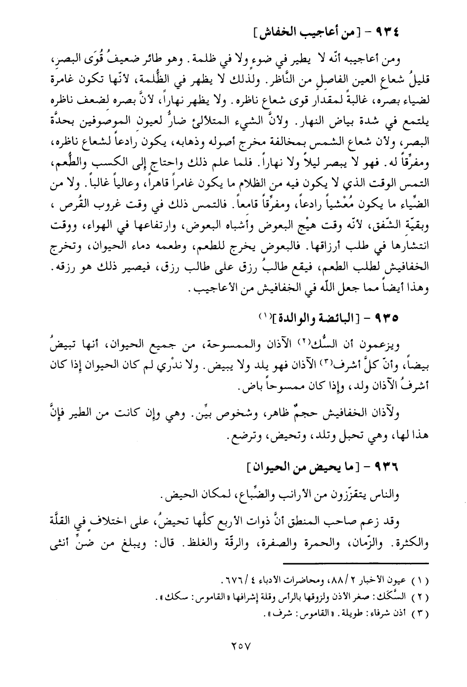 [1] ويزعمون أن السّك [2] الآذان والممسوحة، من جميع الحيوان، أنها تبيض بيضا، وأنّ كلّ أشرف [3] الآذان فهو يلد ولا يبيض. ولا ندري لم كان الحيوان إذا كان أشرف الآذان ولد، وإذا كان ممسوحا باض.
