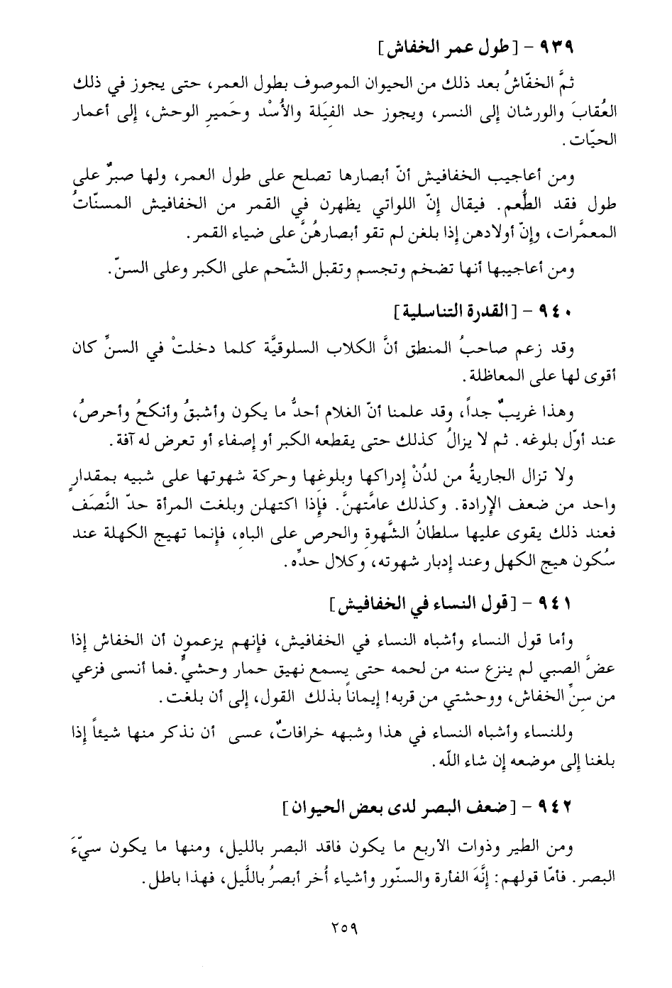 وأما قول النساء وأشباه النساء في الخفافيش، فإنهم يزعمون أن الخفاش إذا عضّ الصبي لم ينزع سنه من لحمه حتى يسمع نهيق حمار وحشيّ. فما أنسى فزعي من سنّ الخفاش، ووحشتي من قربه! إيمانا بذلك القول، إلى أن بلغت.