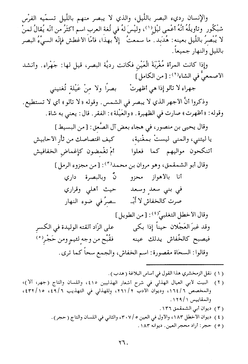 والإنسان رديء البصر باللّيل، والذي لا يبصر منهم باللّيل تسمّيه الفرس شبكور وتأويله أنّه أعمى ليل [1] ، وليس له في لغة العرب اسم أكثر من أنّه يقال لمن لا يبصر باللّيل بعينه: هدبد. ما سمعت إلّا بهذا، فأمّا الأغطش فإنّه السيّء البصر بالليل والنهار جميعا.