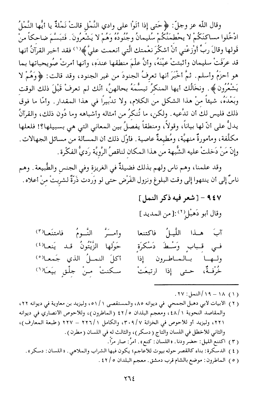 . ونخالك أيها المنكر تبسّمه بحالهنّ، أنّك لم تعرف قبل ذلك الوقت وبعده، شيئا من هذا الشكل من الكلام، ولا تدبيرا في هذا المقدار. وأمّا ما فوق ذلك فليس لك أن تدّعيه. ولكن، ما تنكر من أمثاله وأشباهه وما دون ذلك، والقرآن يدلّ على أنّ لها بيانا، وقولا، ومنطقا يفصل بين المعاني التي هي بسبيلها؟! فلعلها مكلّفة، ومأمورة منهيّة، ومطيعة عاصية. فأوّل ذلك أن المسألة من مسائل الجهالات.