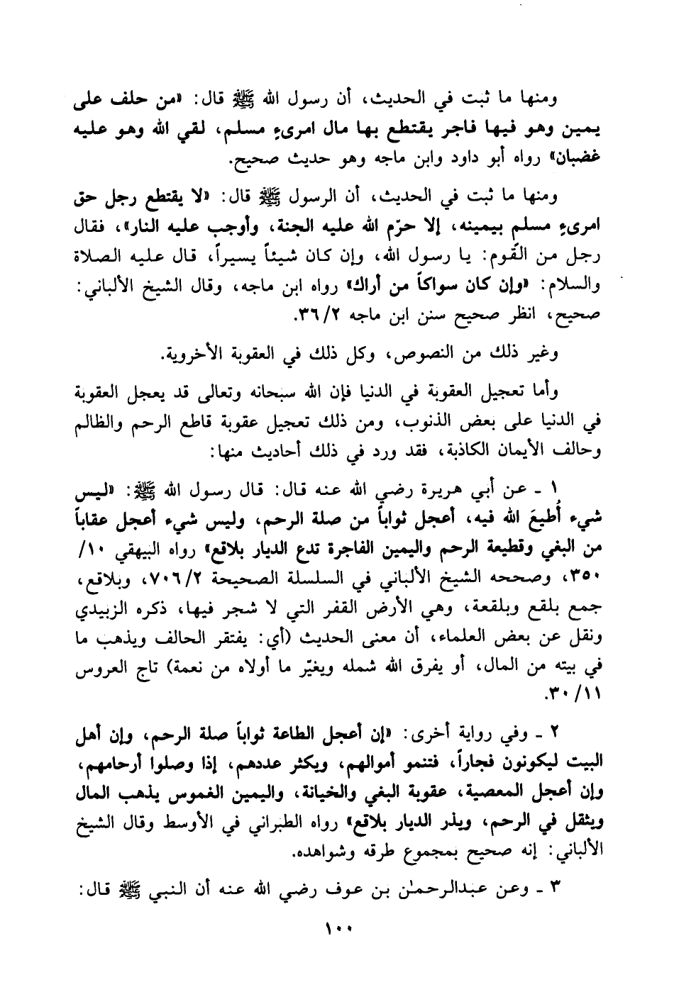 1 - عن أبي هريرة - رضي الله عنه - قال: قال رسول الله - صلى الله عليه وسلم -: (ليس شيء أُطيعَ الله فيه، أعجل ثواباً من صلة الرحم، وليس شيء أعجل عقاباً من البغي وقطيعة الرحم واليمين الفاجرة تدع الديار بلاقع) رواه البيهقي 10/ 350، وصححه الشيخ الألباني في السلسلة الصحيحة 2/ 706، وبلاقع، جمع بلقع وبلقعة، وهي الأرض القفر التي لا شجر فيها، ذكره الزبيدي ونقل عن بعض العلماء، أن معنى الحديث " أي يفتقر الحالف ويذهب ما في بيته من المال، أو يفرق الله شمله ويغيّر ما أولاه من نعمة " تاج العروس 11/ 30.