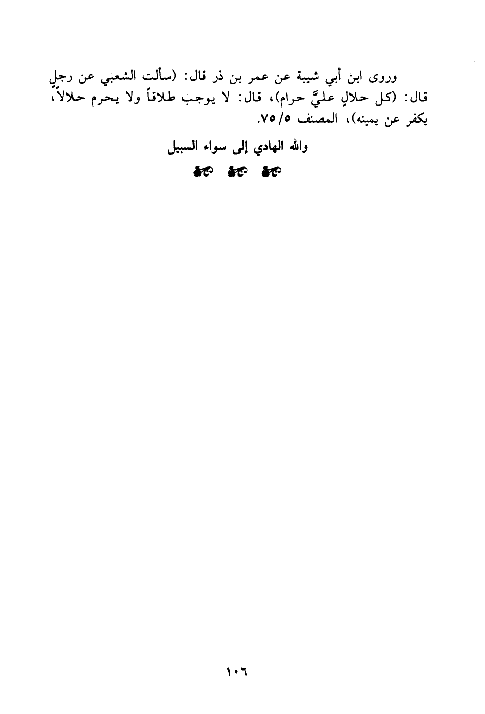 وروى ابن أبي شيبة عن عمر بن ذر قال: " سألت الشعبي عن رجلٍ قال " كل حلالٍ عليَّ حرام "، قال: لا يوجب طلاقاً ولا يحرم حلالاً، يكفر عن يمينه " المصنف 5/ 75.
