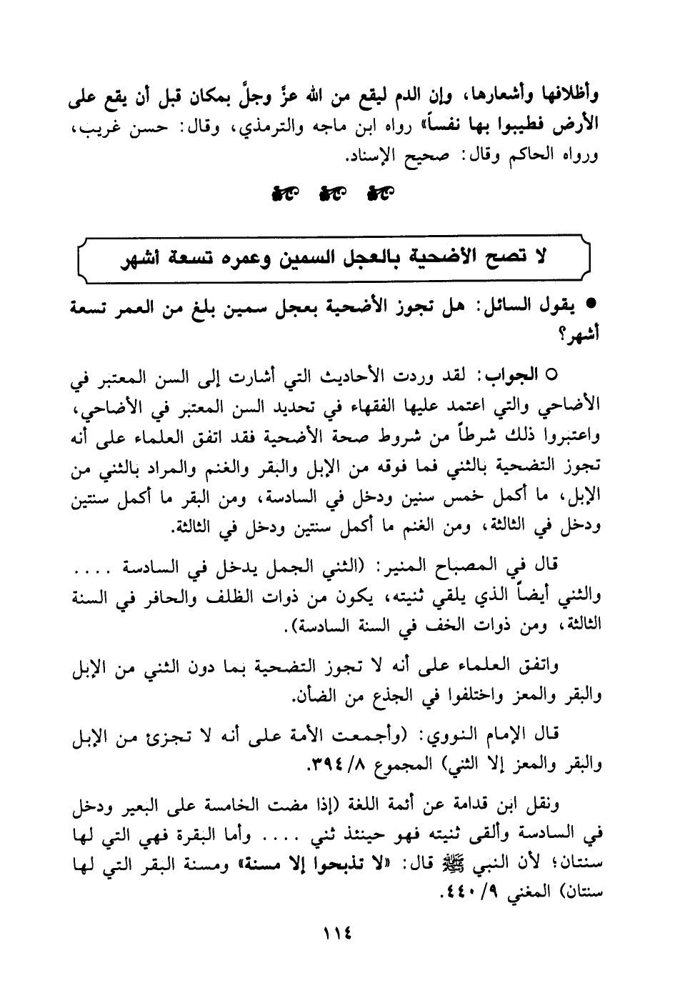الجواب: لقد وردت الأحاديث التي أشارت إلى السن المعتبر في الأضاحي والتي اعتمد عليها الفقهاء في تحديد السن المعتبر في الأضاحي، واعتبروا ذلك شرطاً من شروط صحة الأضحية فقد اتفق العلماء على أنه تجوز التضحية بالثني فما فوقه من الإبل والبقر والغنم والمراد بالثني من الإبل، ما أكمل خمس سنين ودخل في السادسة، ومن البقر ما أكمل سنتين ودخل في الثالثة، ومن الغنم ما أكمل سنتين ودخل في الثالثة.